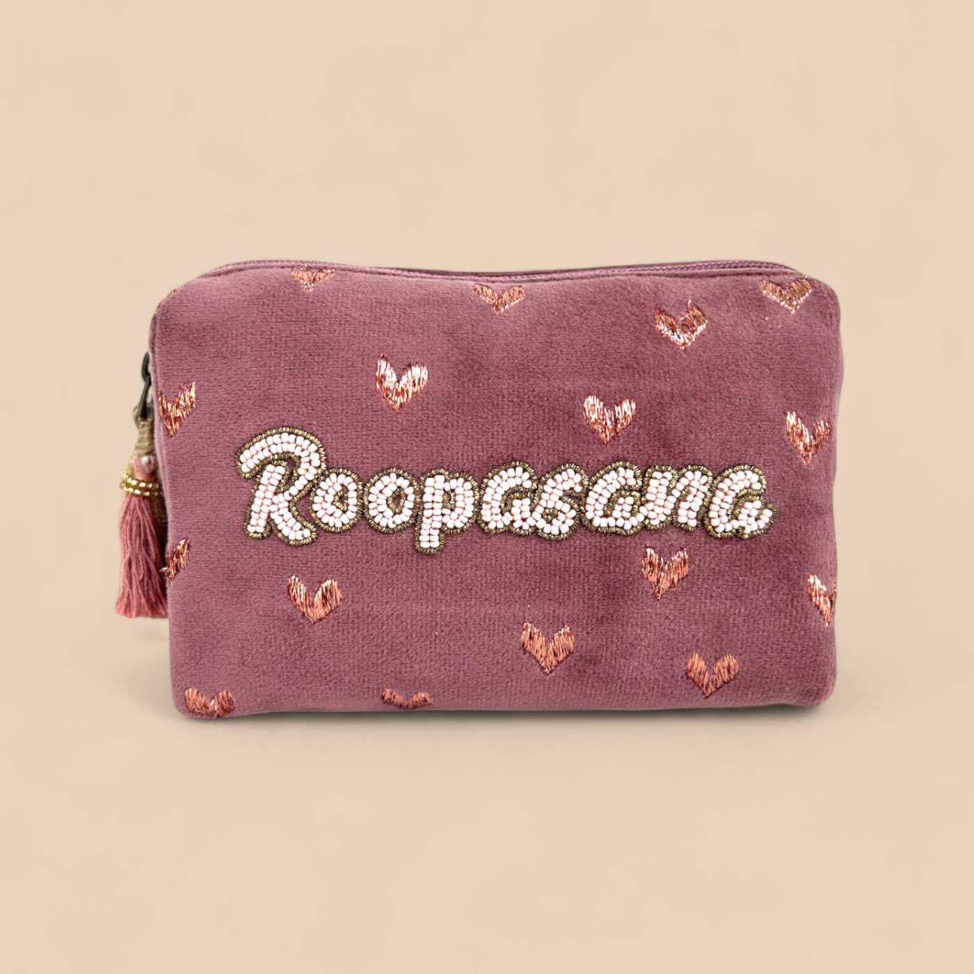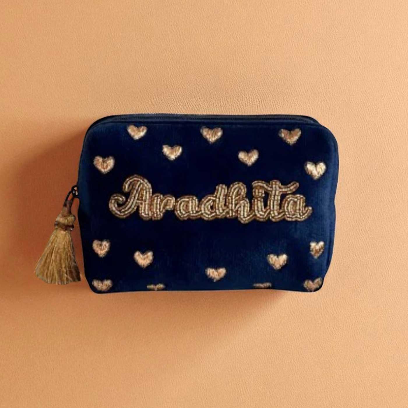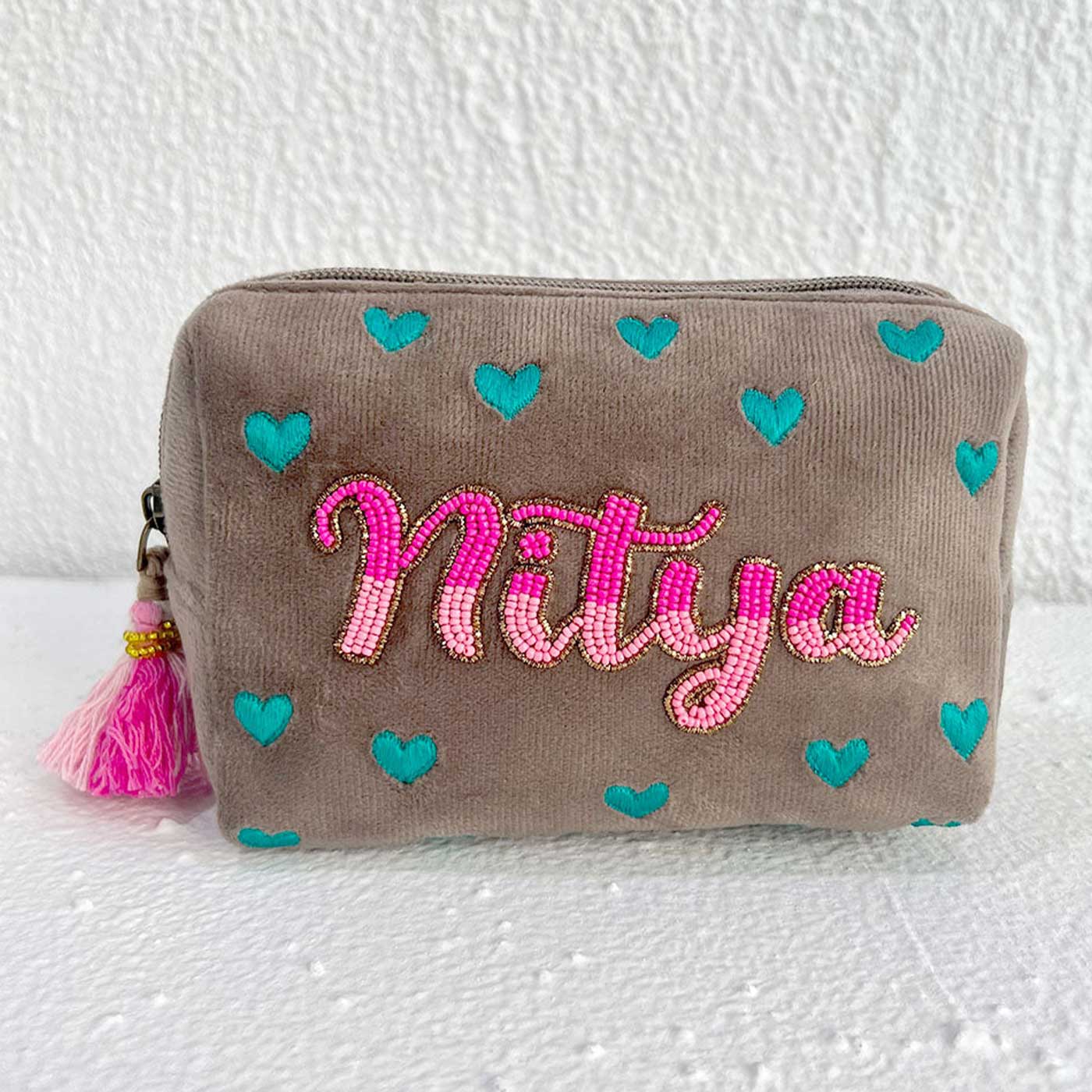 - Hand embroidery in heart motifs personalizes it with your name, adding a playful and stylish touch.