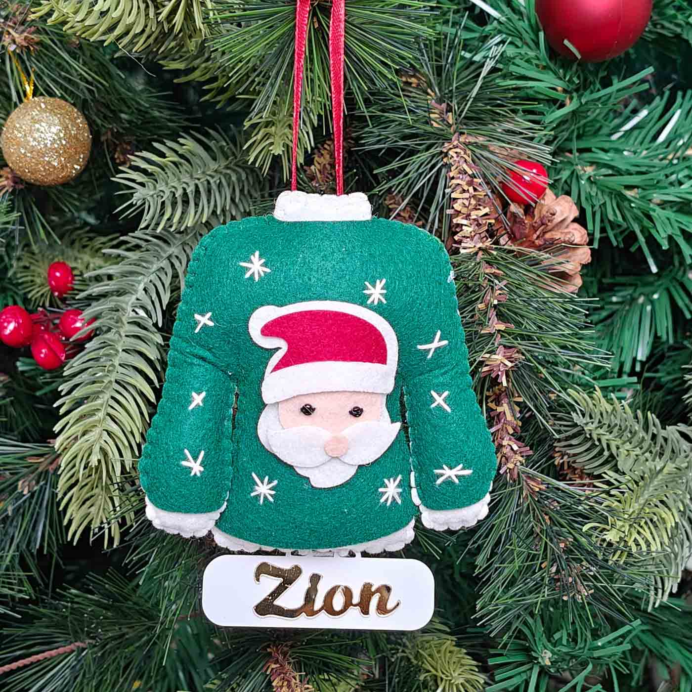 - This festive ornament features a cozy Santa-themed sweater in cheerful pastels.