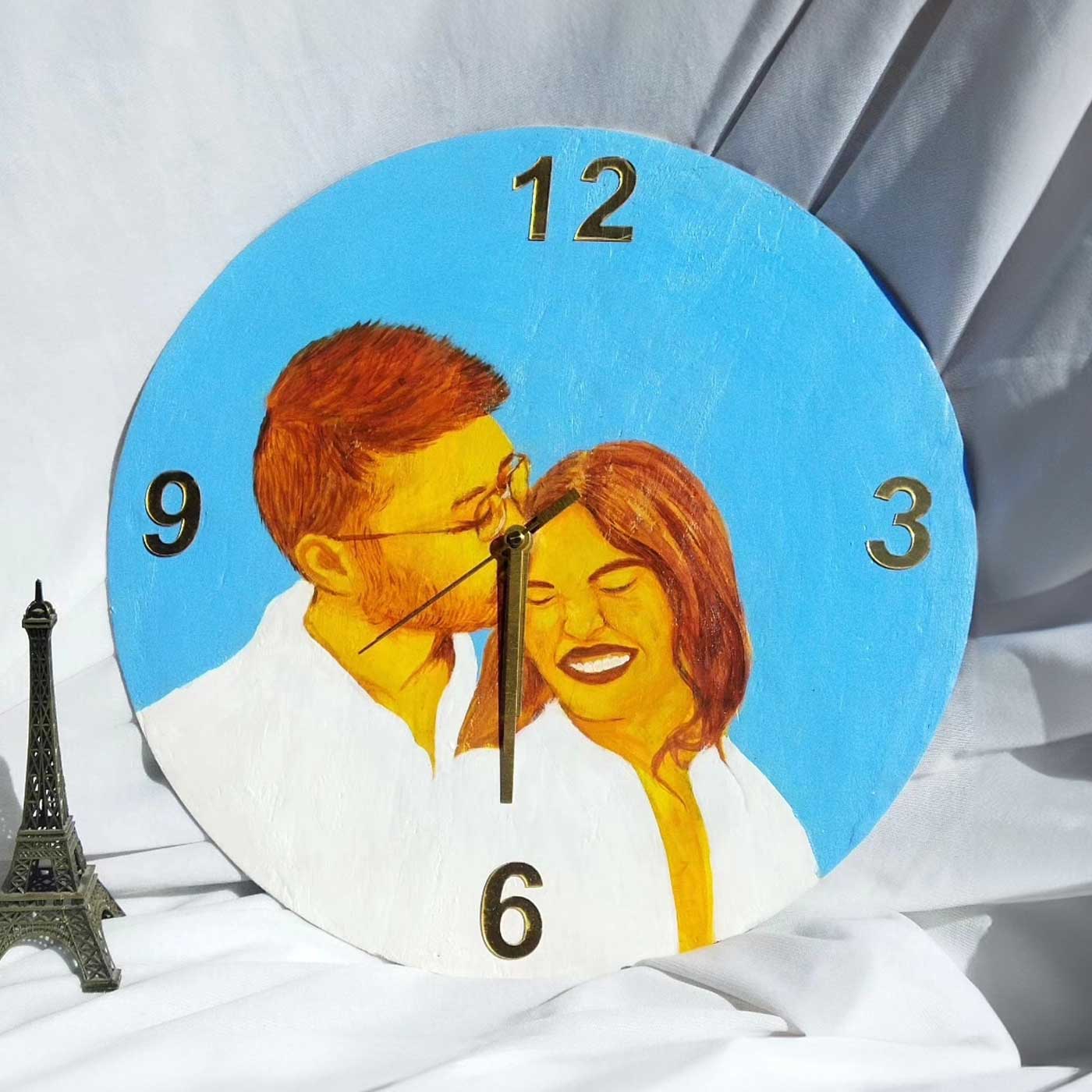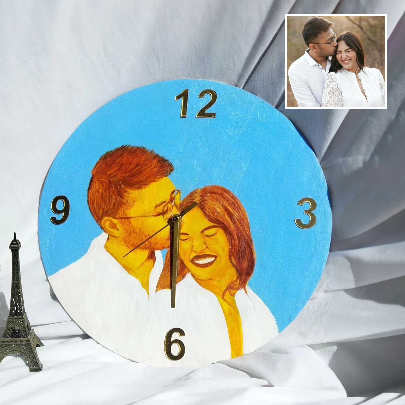- Celebrate cherished moments with this Personalized Photo Based Caricature Round Monochrome Blue Clock Portrait For Couples.