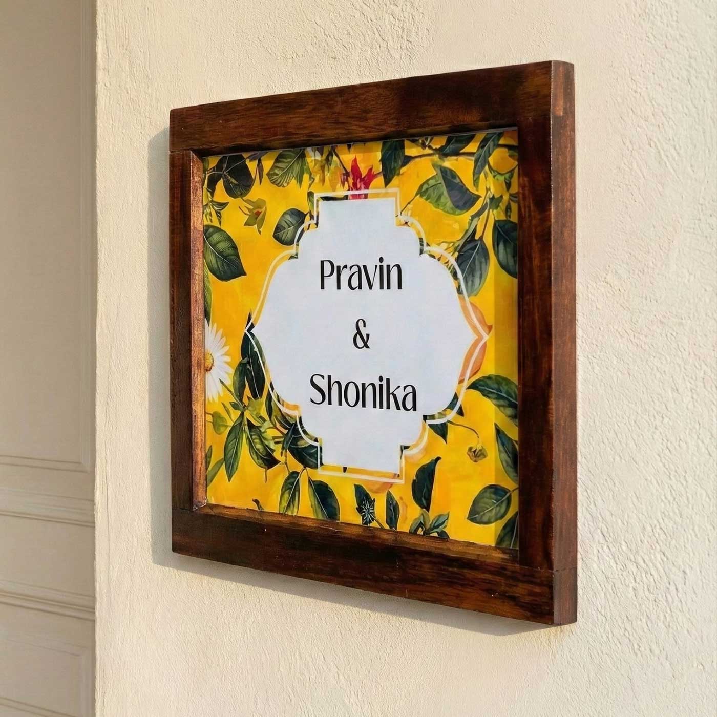 Personalized Yellow Garden Theme Resin Name Plate With Teak Wood Frame