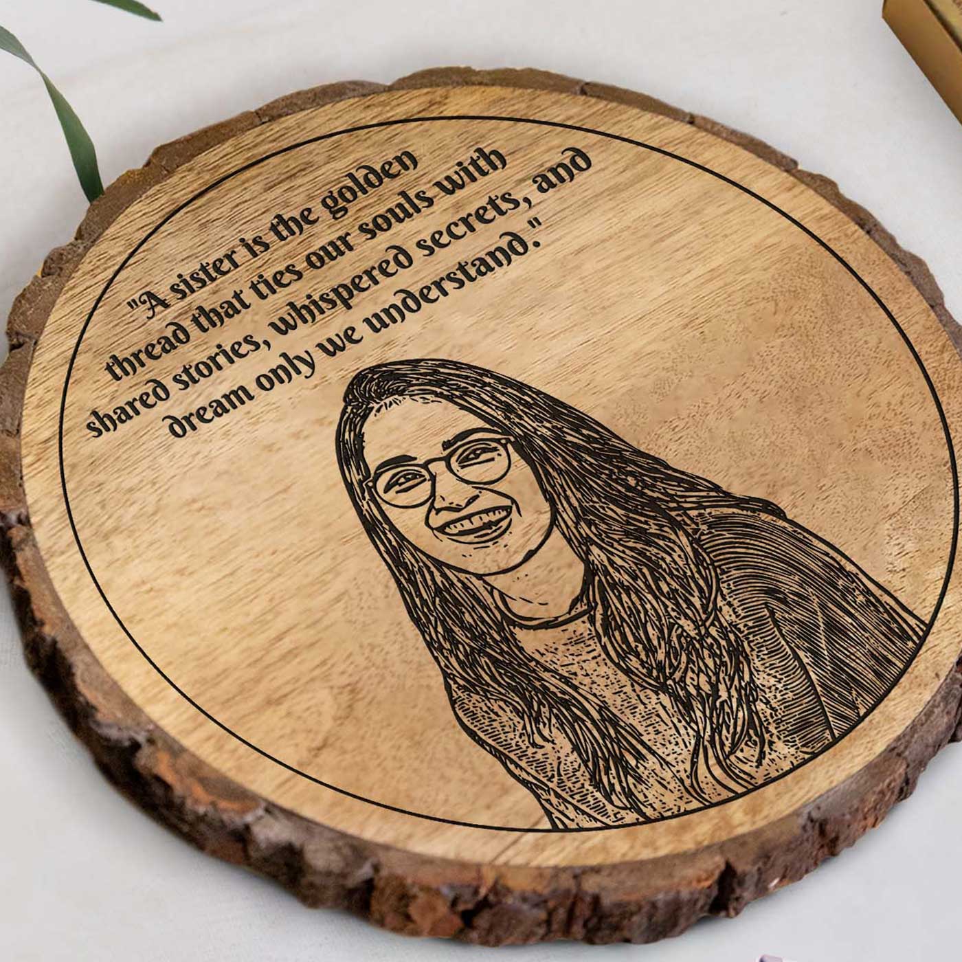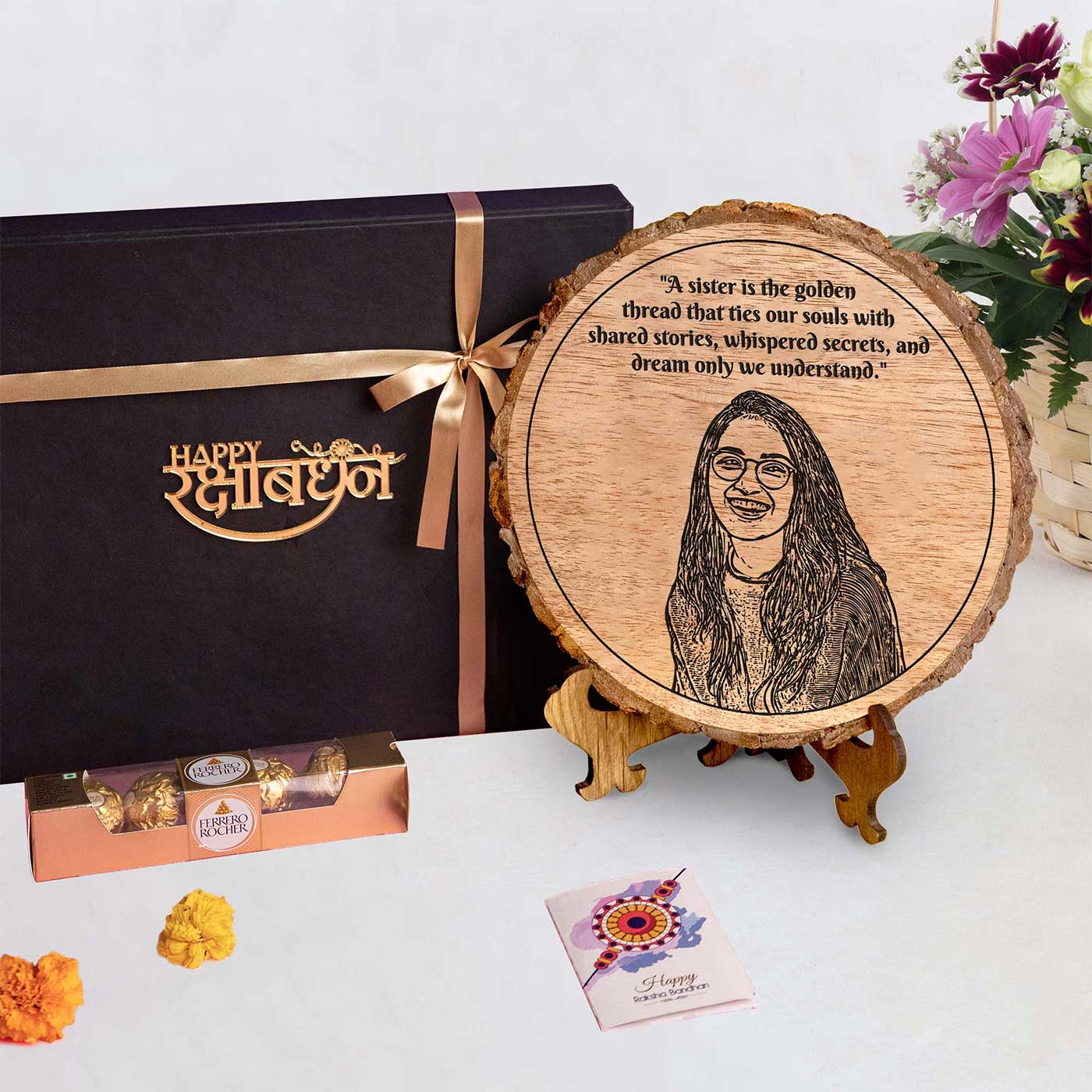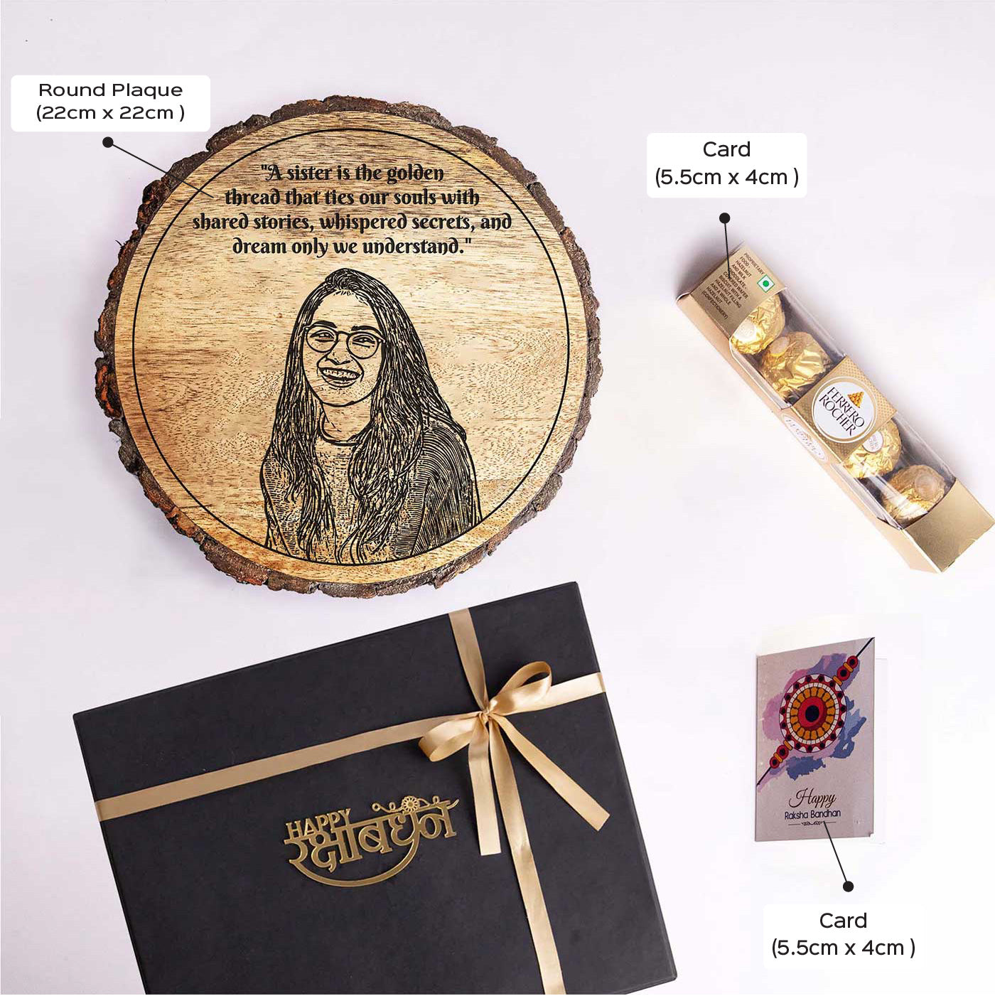 - It features a personalized round wooden plaque with a sweet Rakhi message.