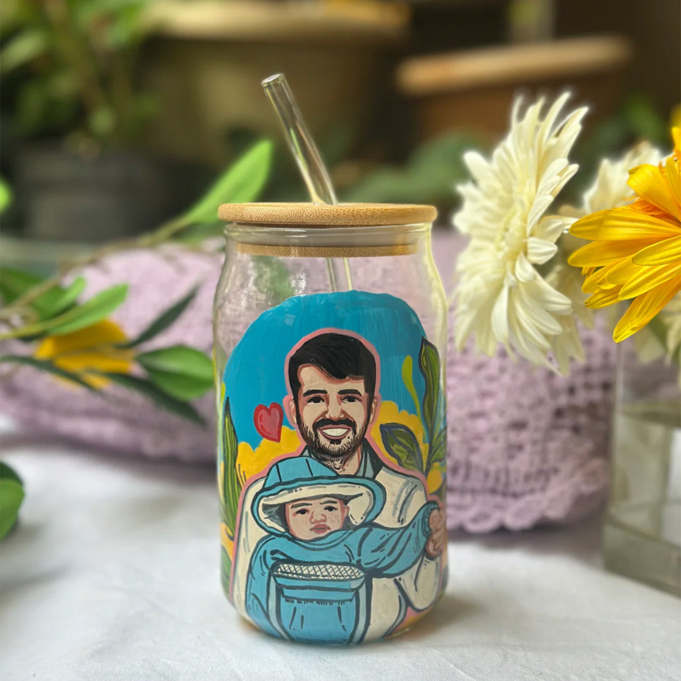 - This 500 ml glass tumbler can be personalized with two characters or themes of your choice.