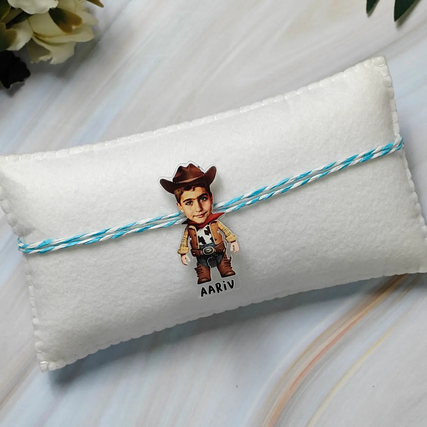 Photo Personalized Reusable Caricature Cow Boy Theme Acrylic Kids Rakhi