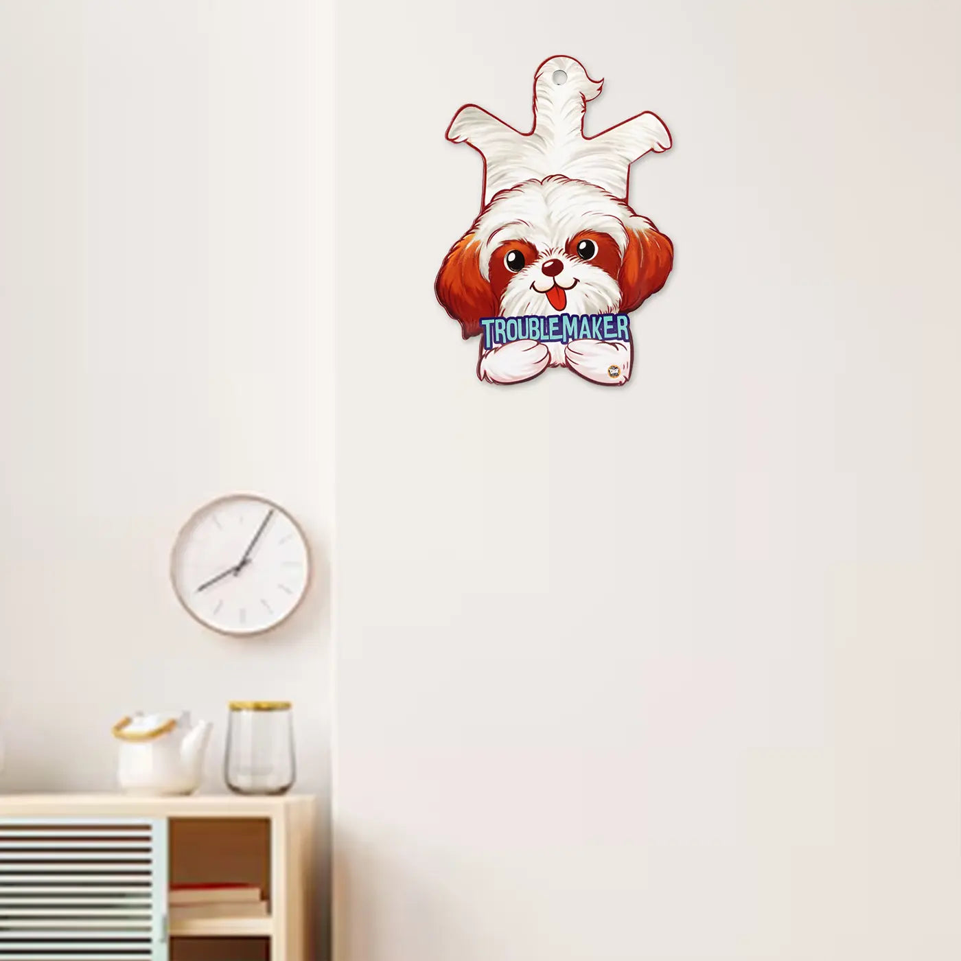 - The charming digital artwork depicts a mischievous Shih Tzu with “Trouble Maker” text, perfect for homes filled with tiny, furry personalities.