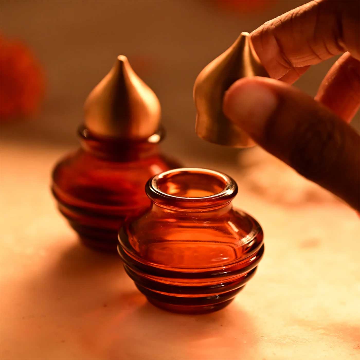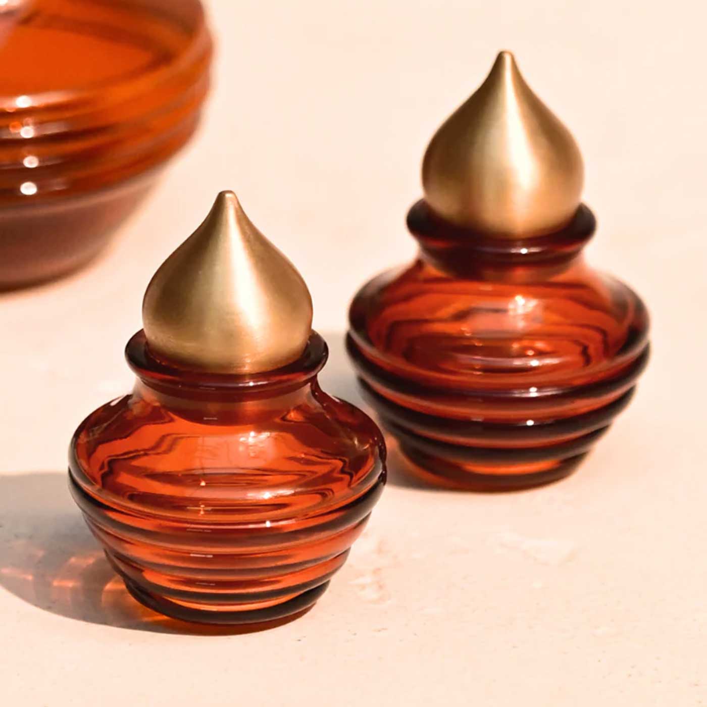 - Each glass kalash features a warm amber hue and a rippled texture that beautifully reflects light.