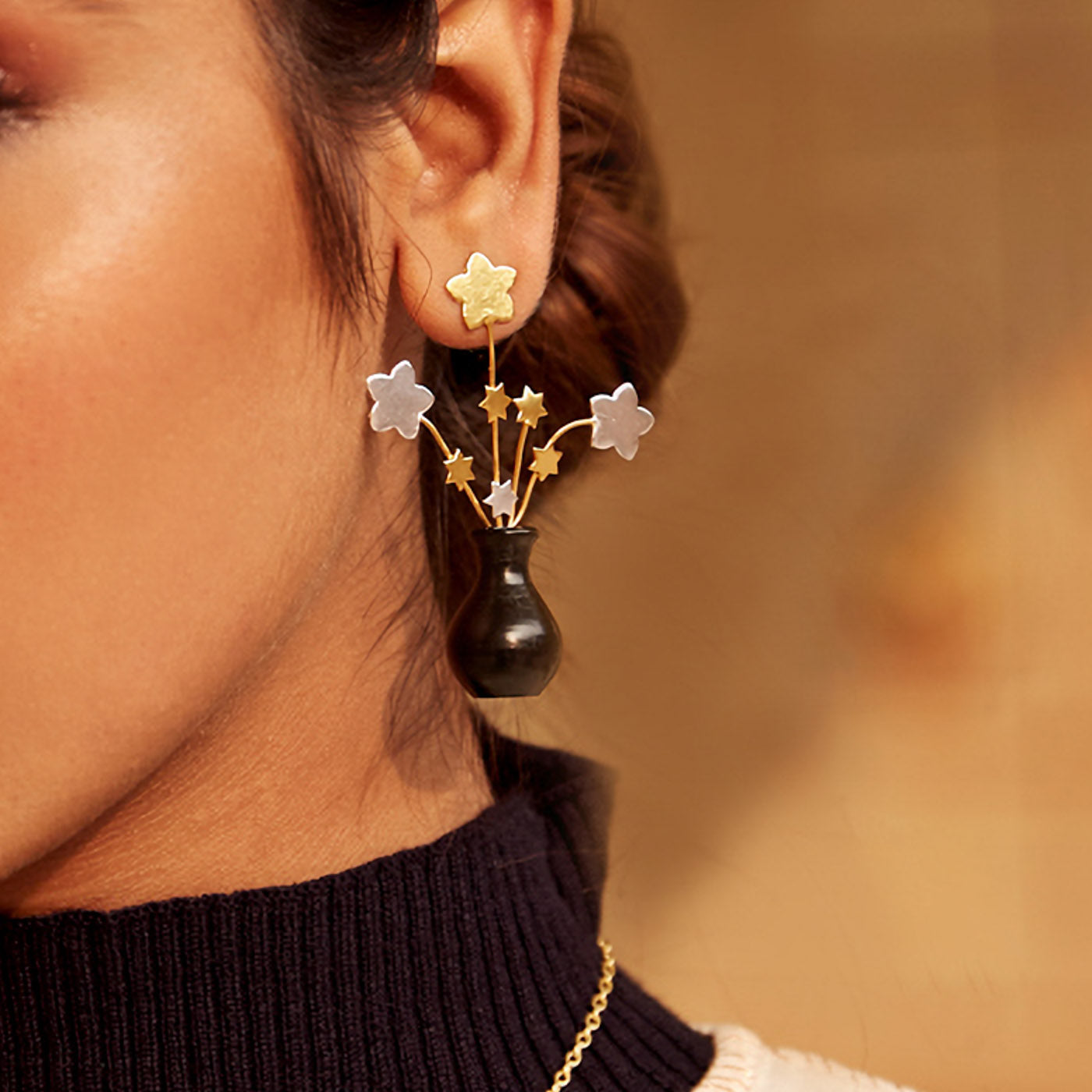 - Rooted in the elegance of Mughal artistry, these earrings reimagine the Surahi as a blooming flower pot — a Guldasta of heritage and grace.