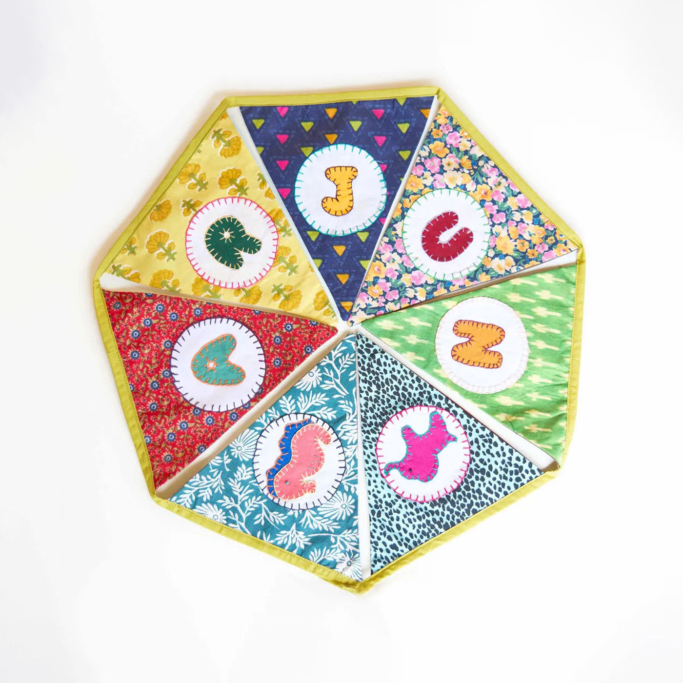 - The fabric is hand-stitched and arranged in a colorful rainbow pattern to add to the vibrant festive aesthetics of your home.