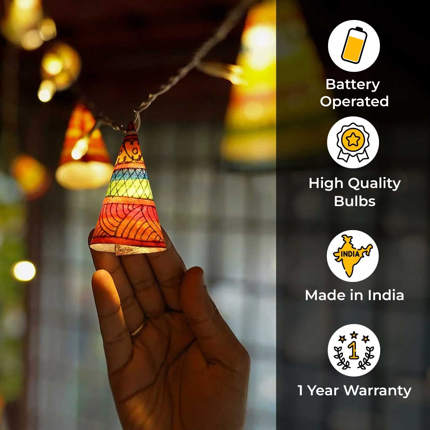 - Handcrafted in genuine leather, the fairy lights are handpainted by skilled artisans using the Tholu Bommalata technique.