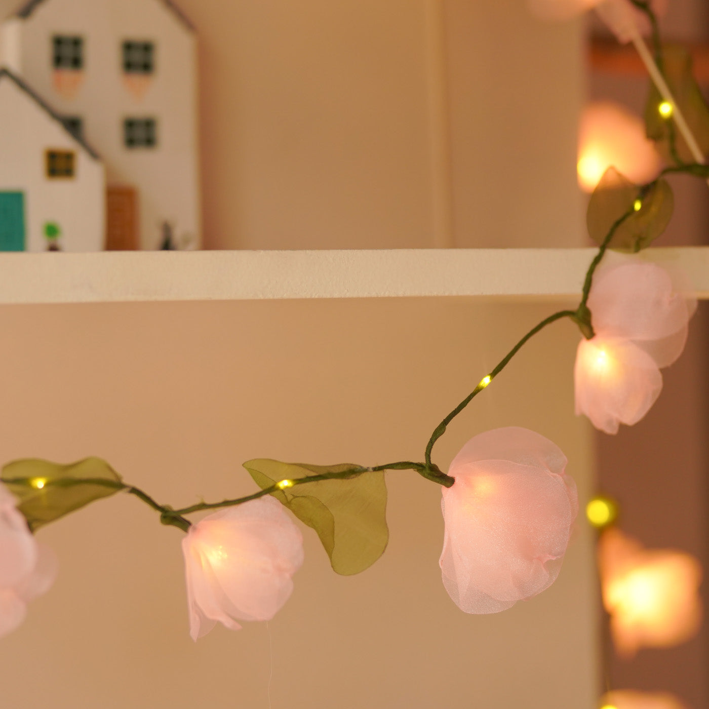 - Handcrafted with delicate tissue and organza blooms, these lights radiate a soft, romantic glow.