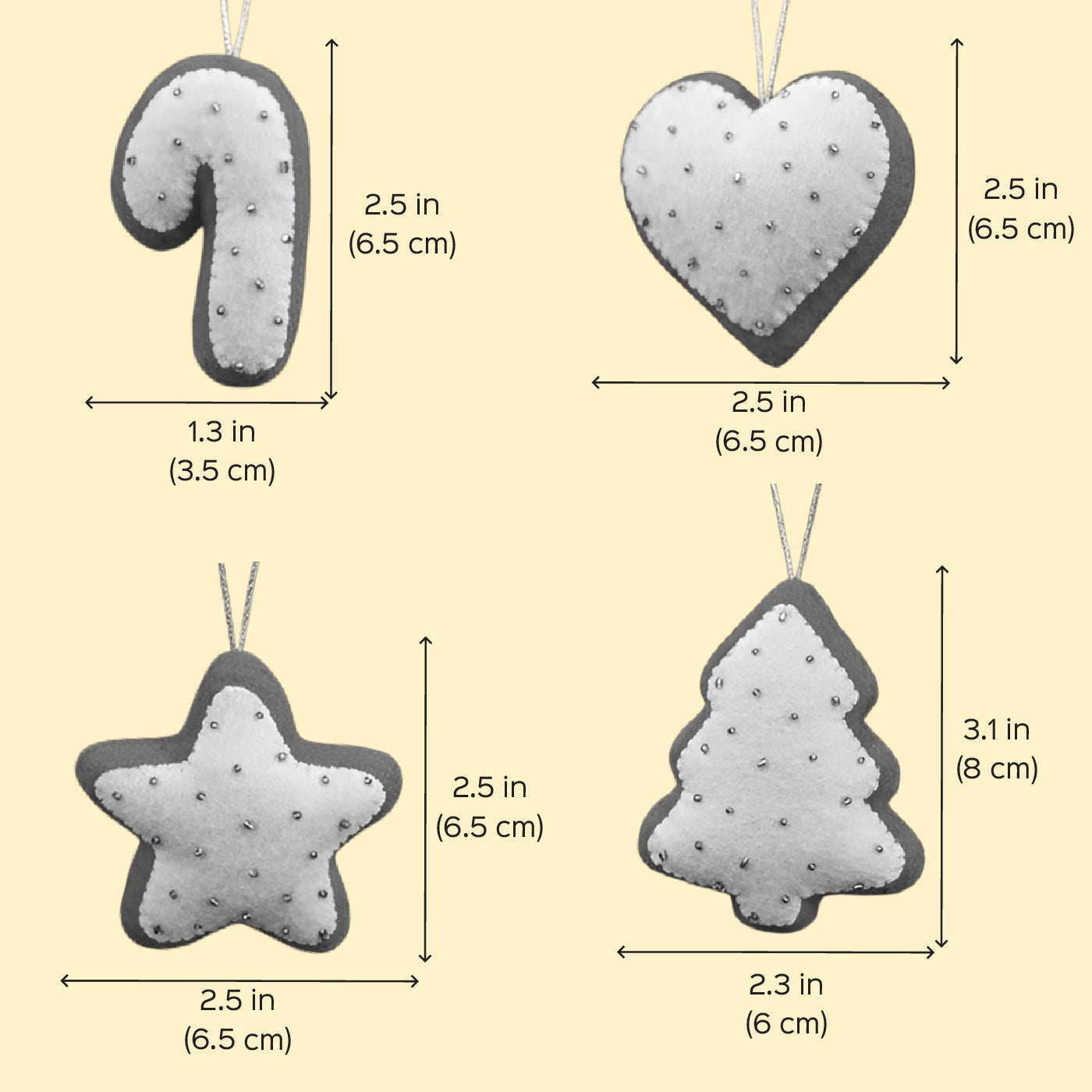 - Featuring Star, Heart, Tree, and Candy shapes, each ornament is carefully crafted from soft felt.