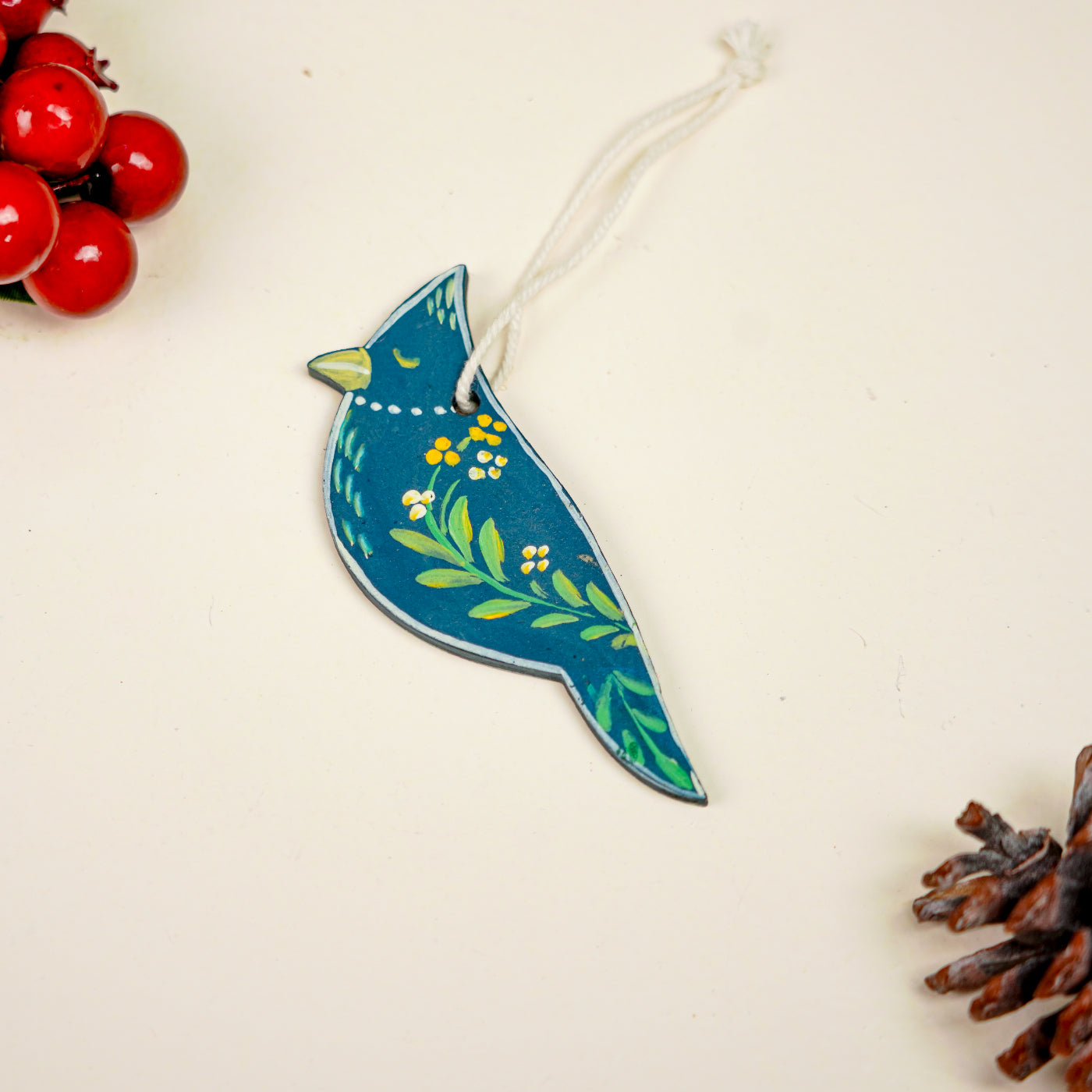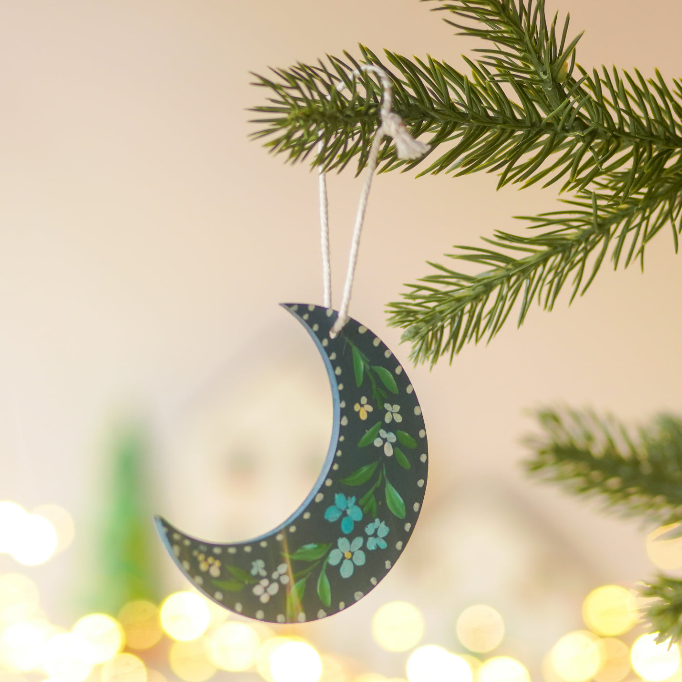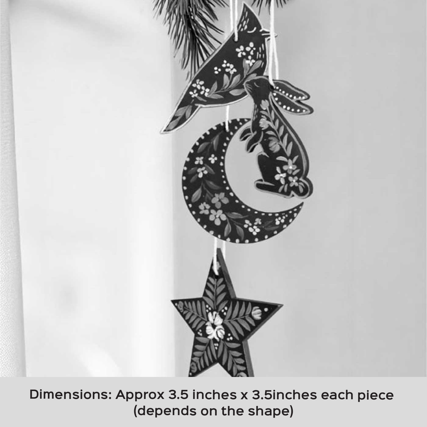 - Each piece — a bird, moon, rabbit, and star — is hand-painted with intricate winter floral motifs.