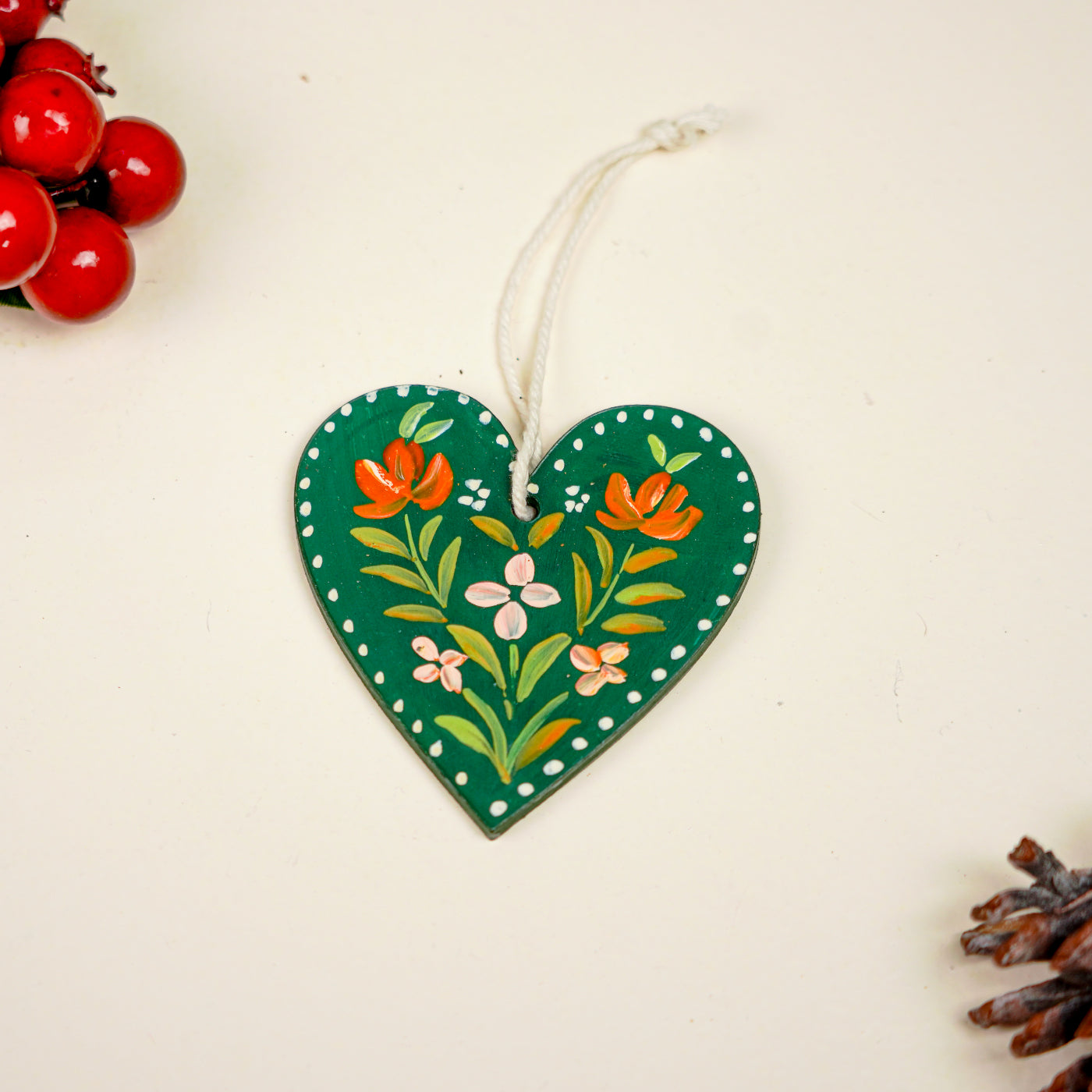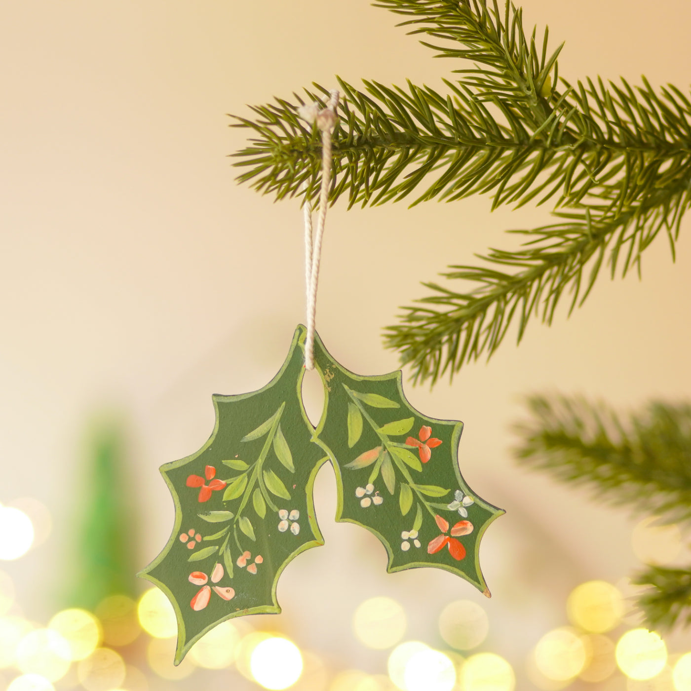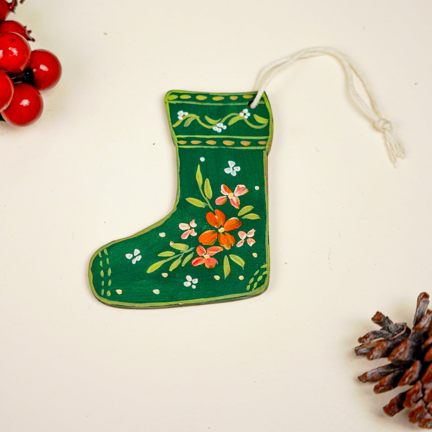 - Each piece — stocking, snowflake, holly leaves, and heart — is hand-painted with snowy florals and winter motifs.
