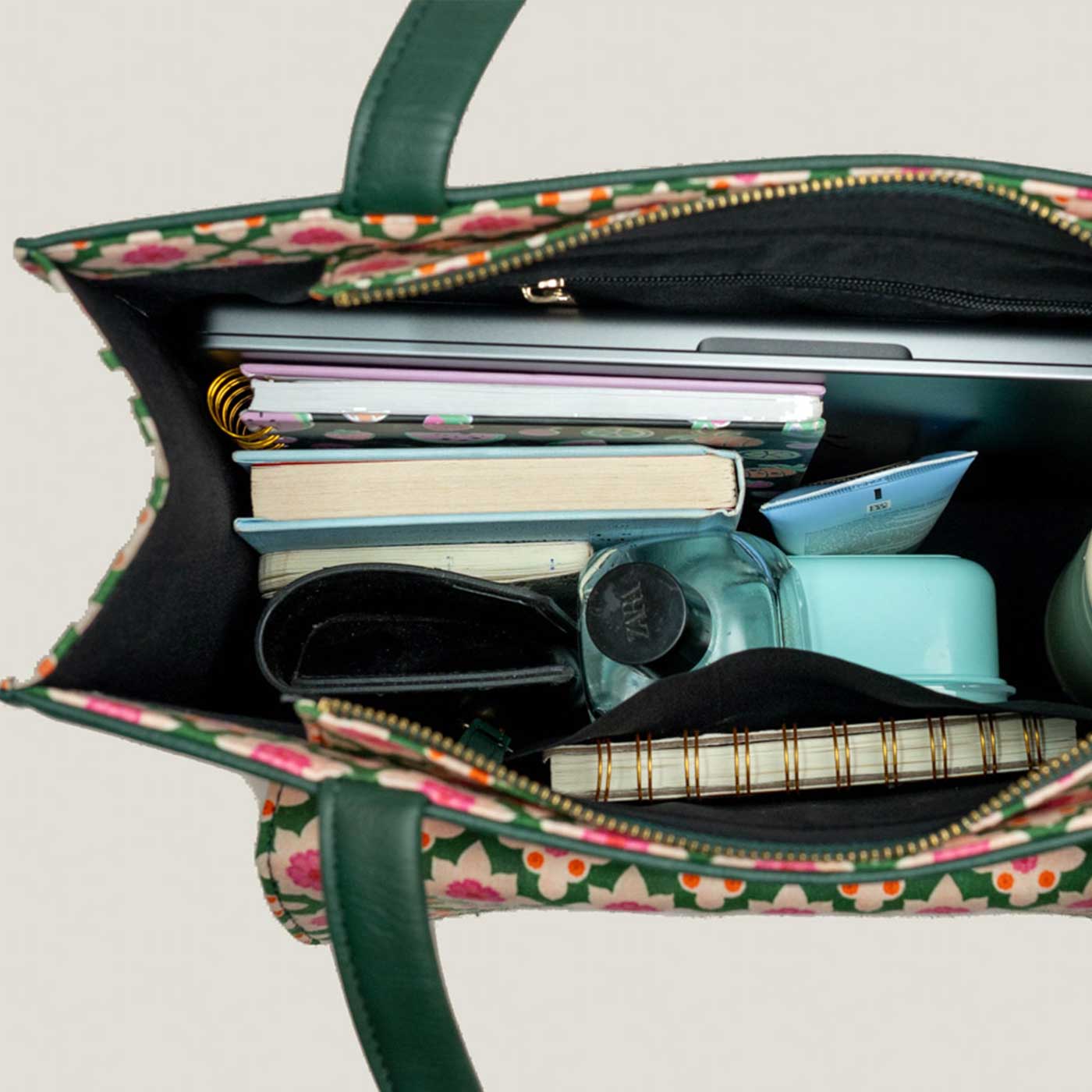 • Spacious enough to fit 13” and 15” laptops along with notebooks, documents, a water bottle, iPad, and even a lunchbox.