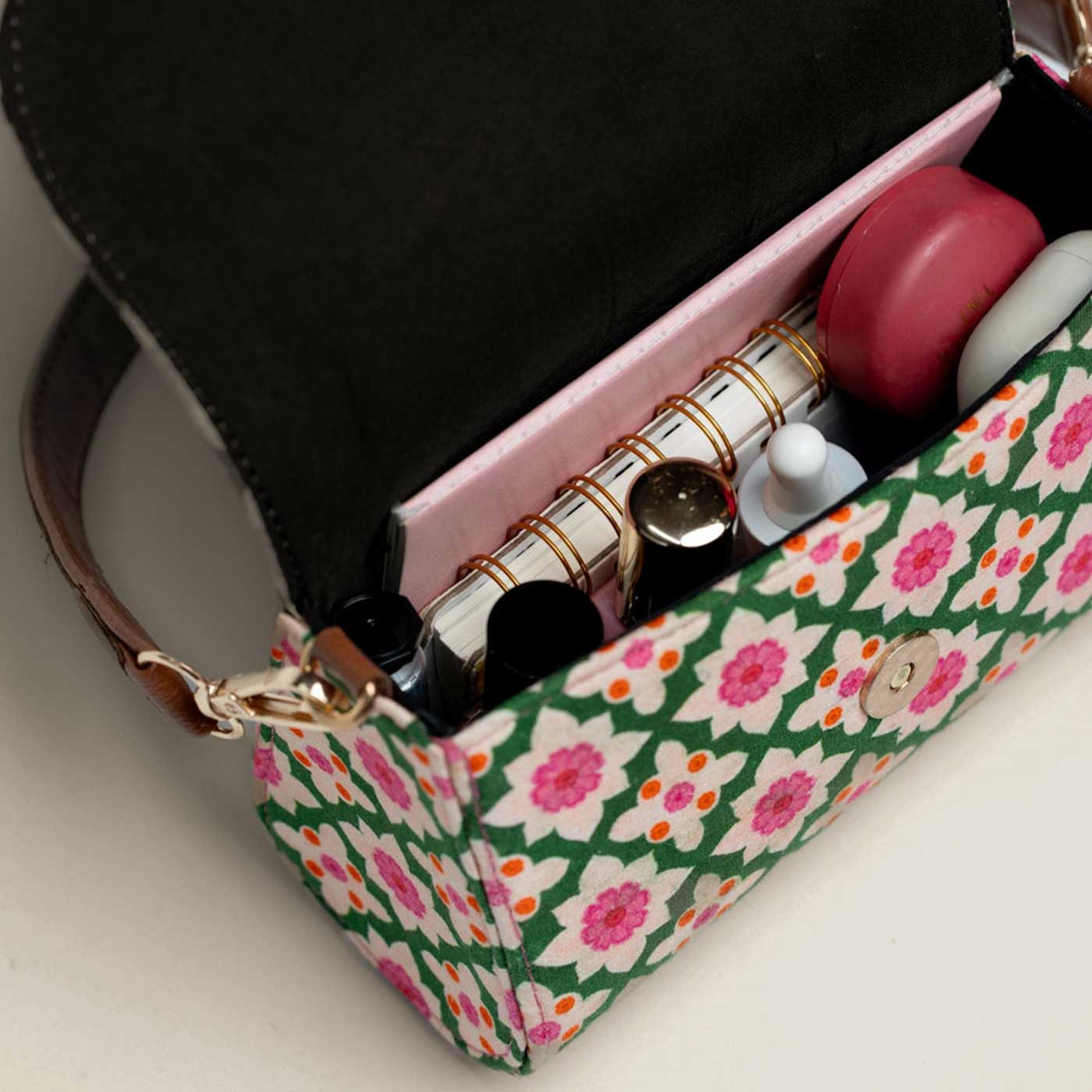 - Its compact yet functional interior comfortably fits your wallet, phone, make-up, and small accessories.