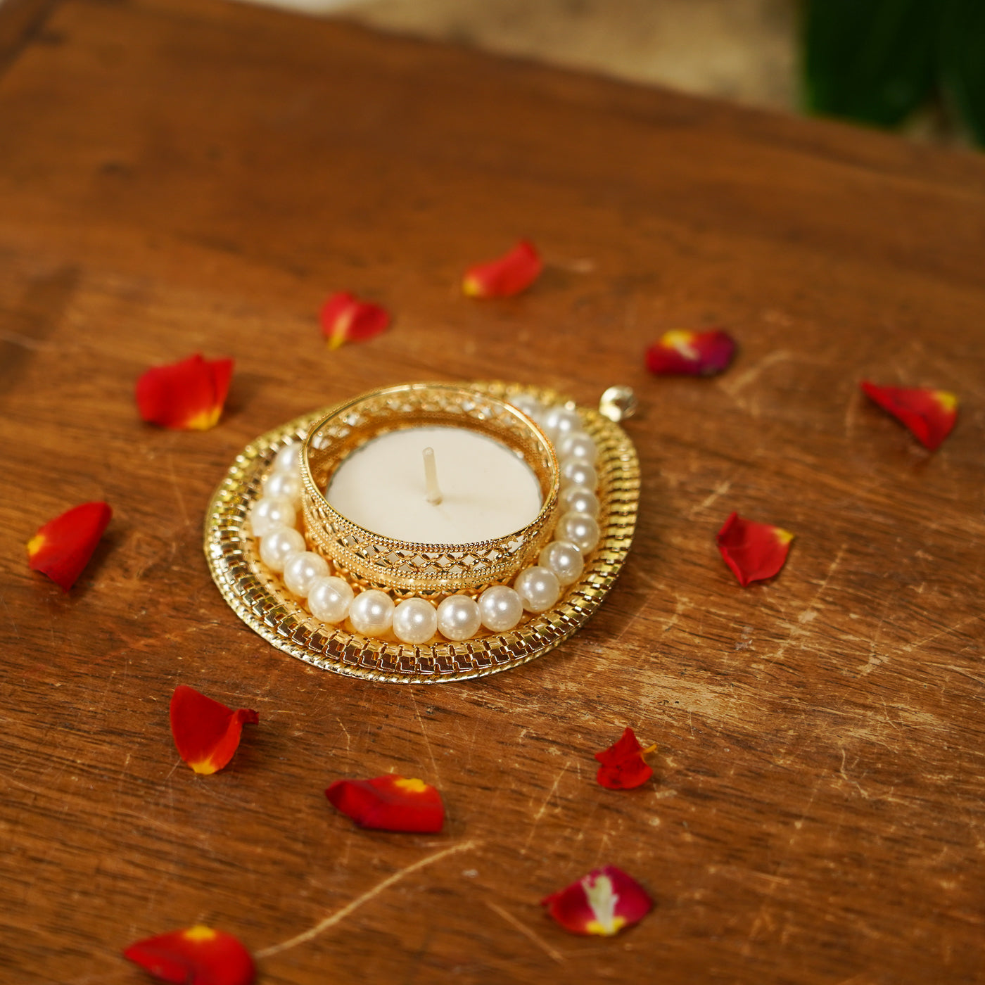 - Featuring a luxurious golden finish and a ring of lustrous pearls, it radiates festive charm and sophistication.