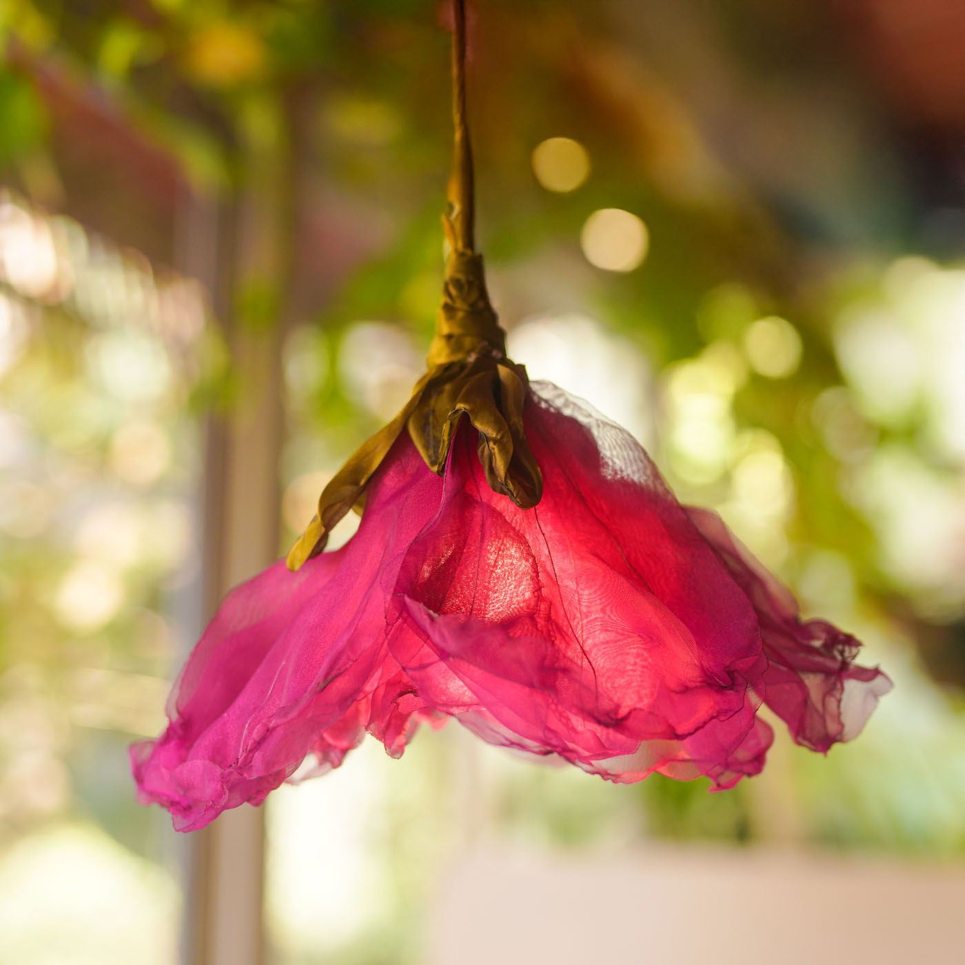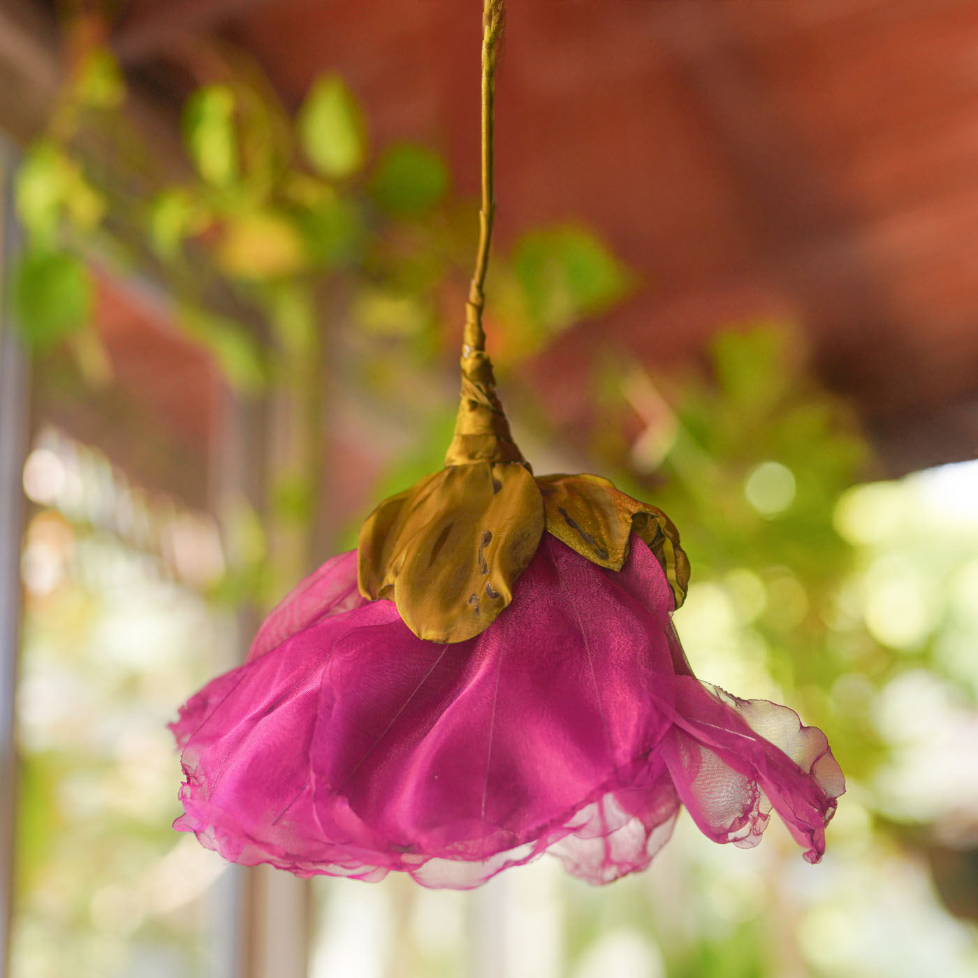 - This pendant lamp features a handcrafted organza flower that radiates a warm, luxurious glow.