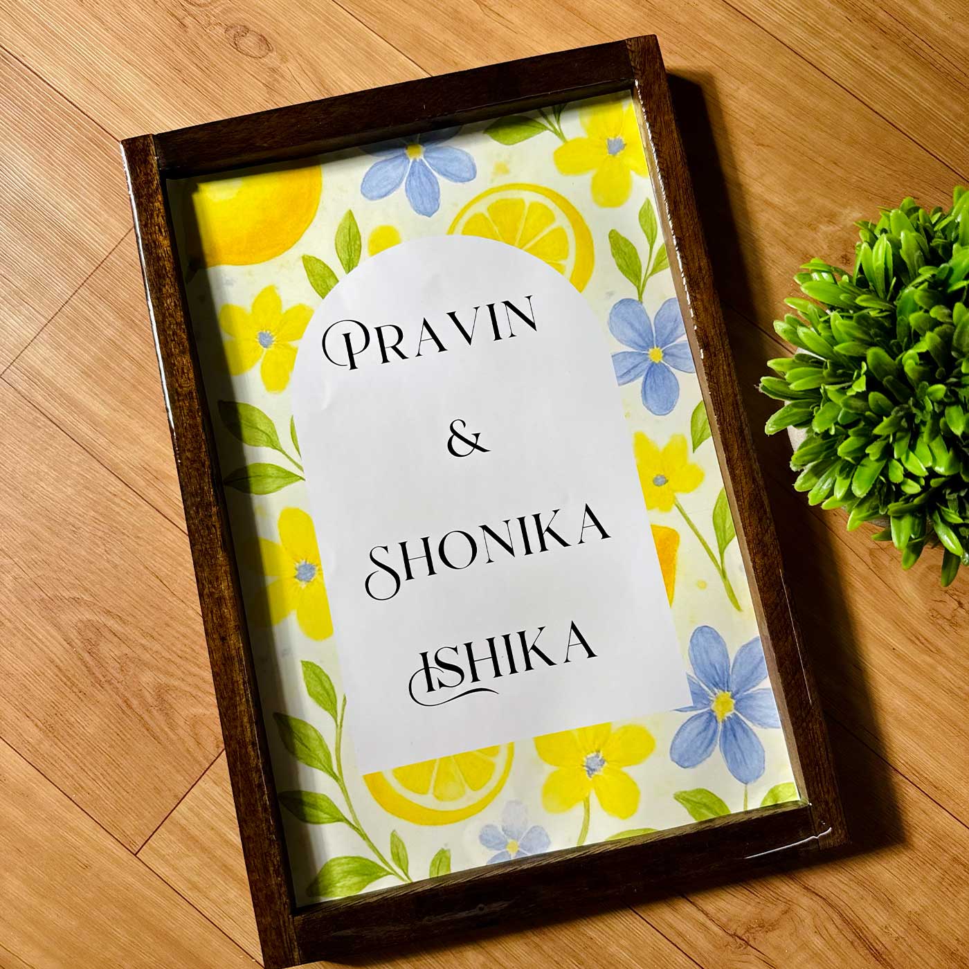 A personalized resin name plate in a teak wood frame to introduce your story.