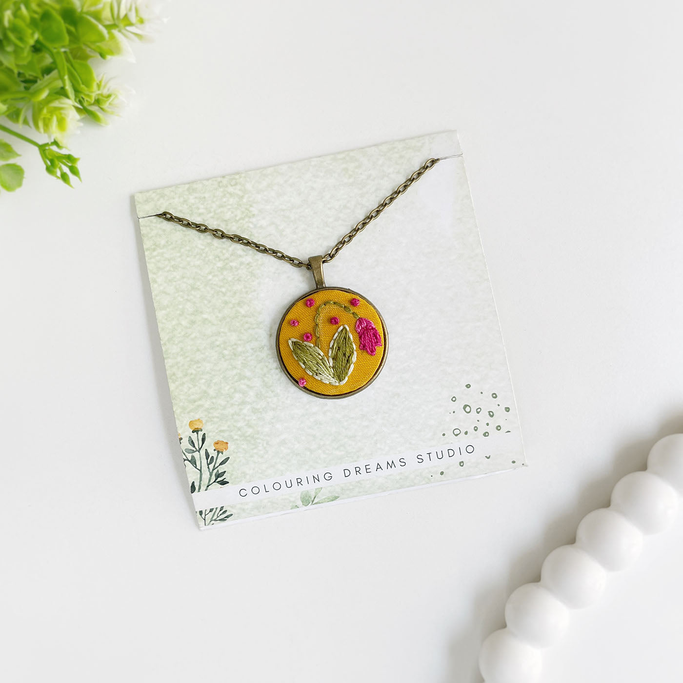 • Bursting with color and handmade charm, this floral embroidered pendant from Colouring Dreams Studio celebrates bold expression and delicate craft.