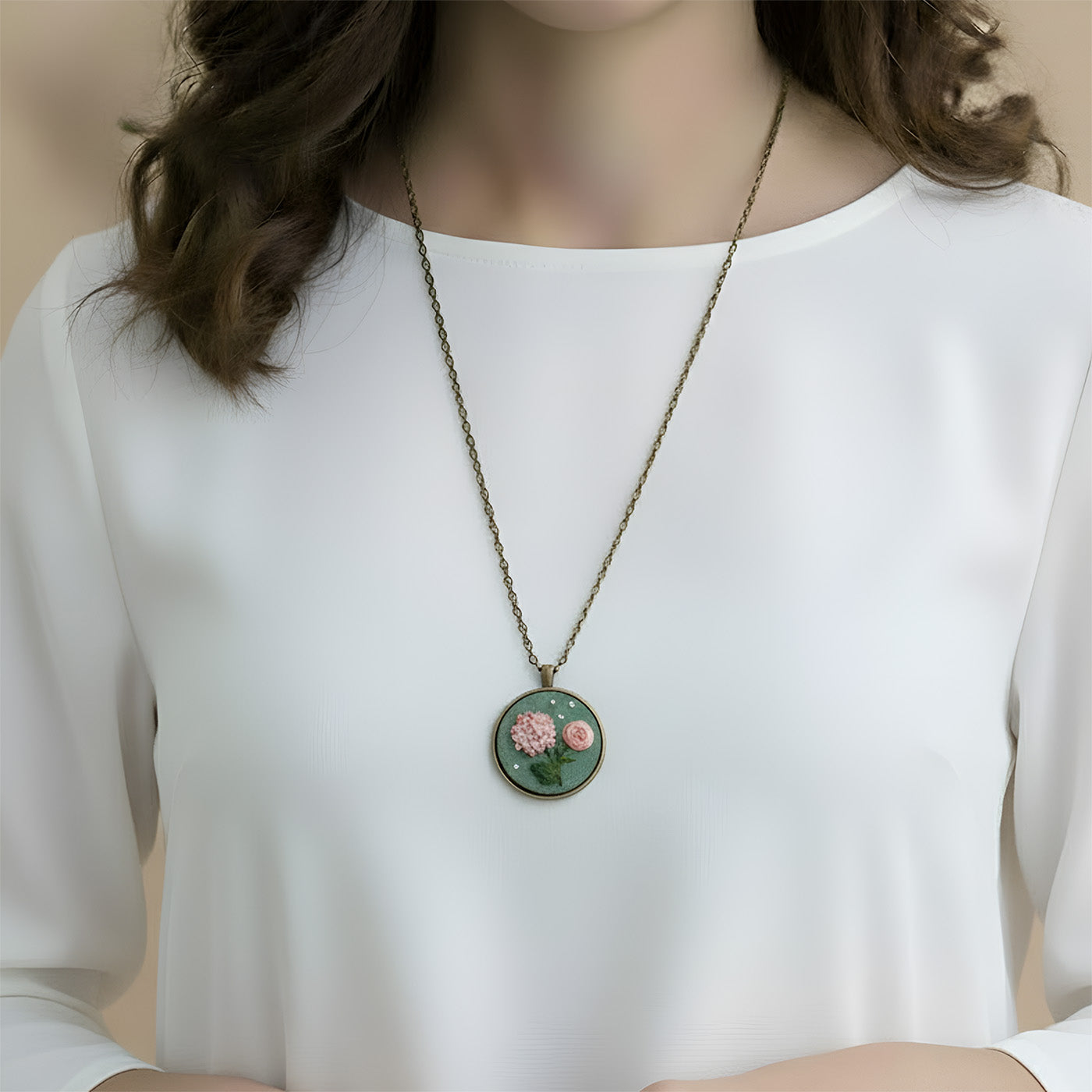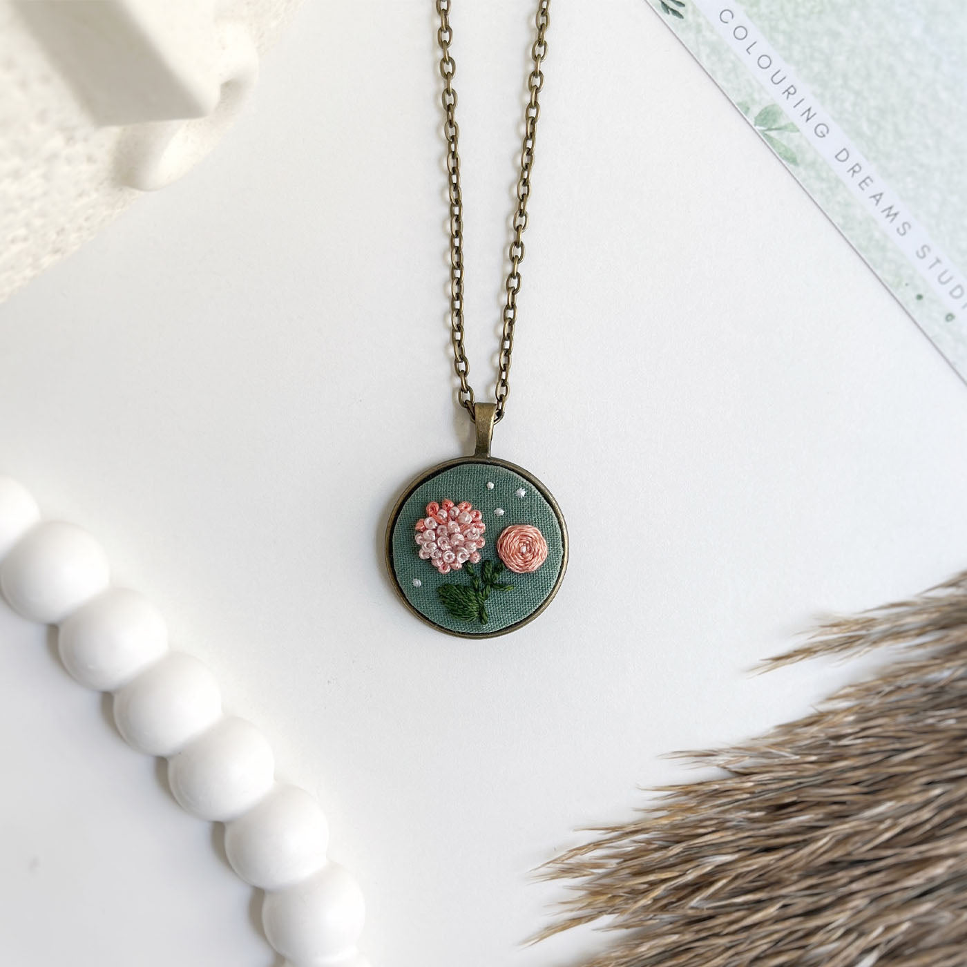 - This pendant captures the delicate beauty of hand-embroidered florals on a soft, misty green fabric.