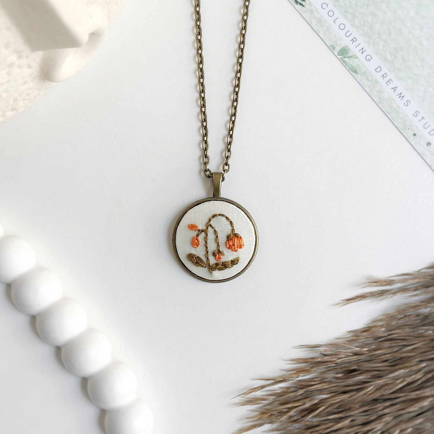 - This pendant captures the gentle elegance of hand-embroidered flora on a crisp white fabric base.