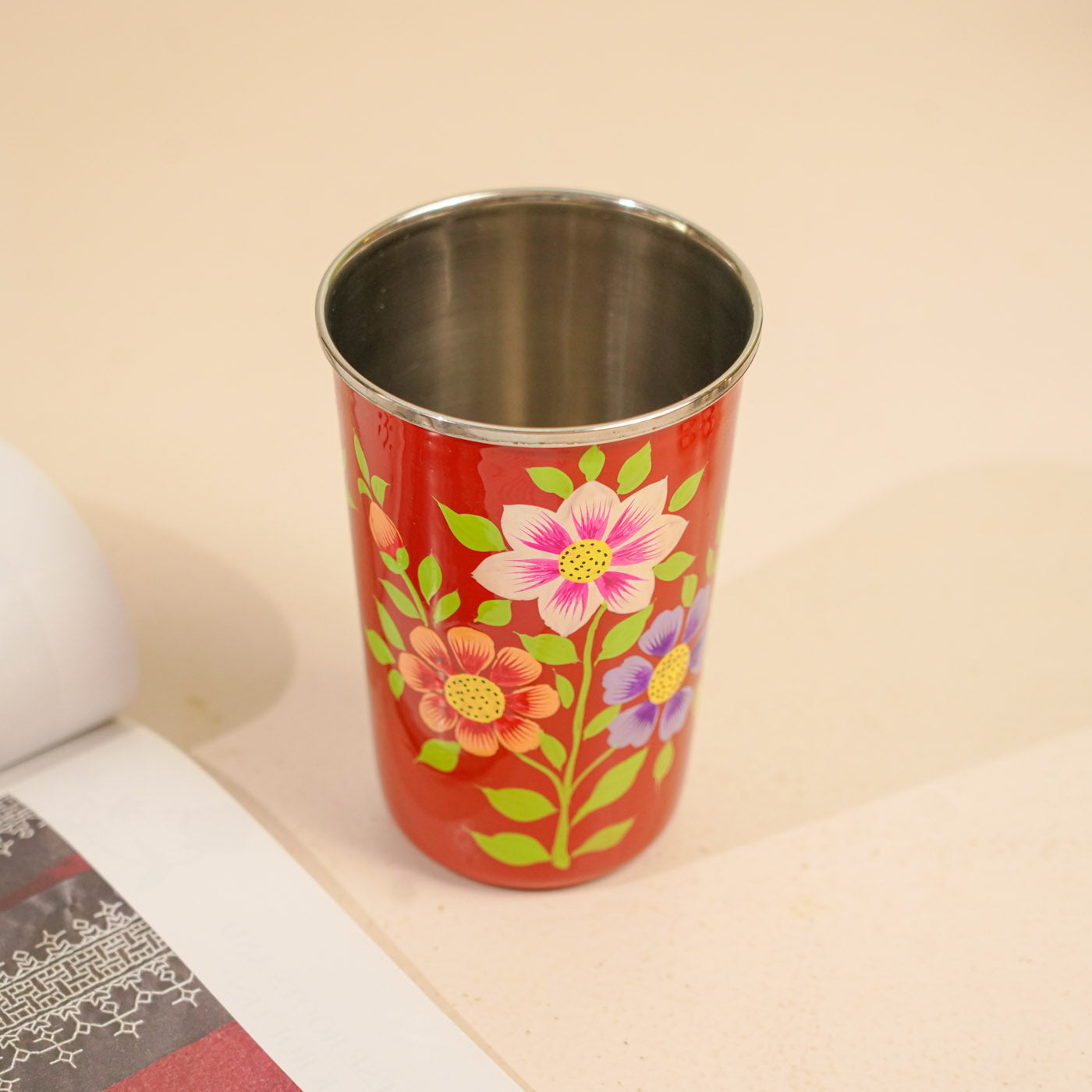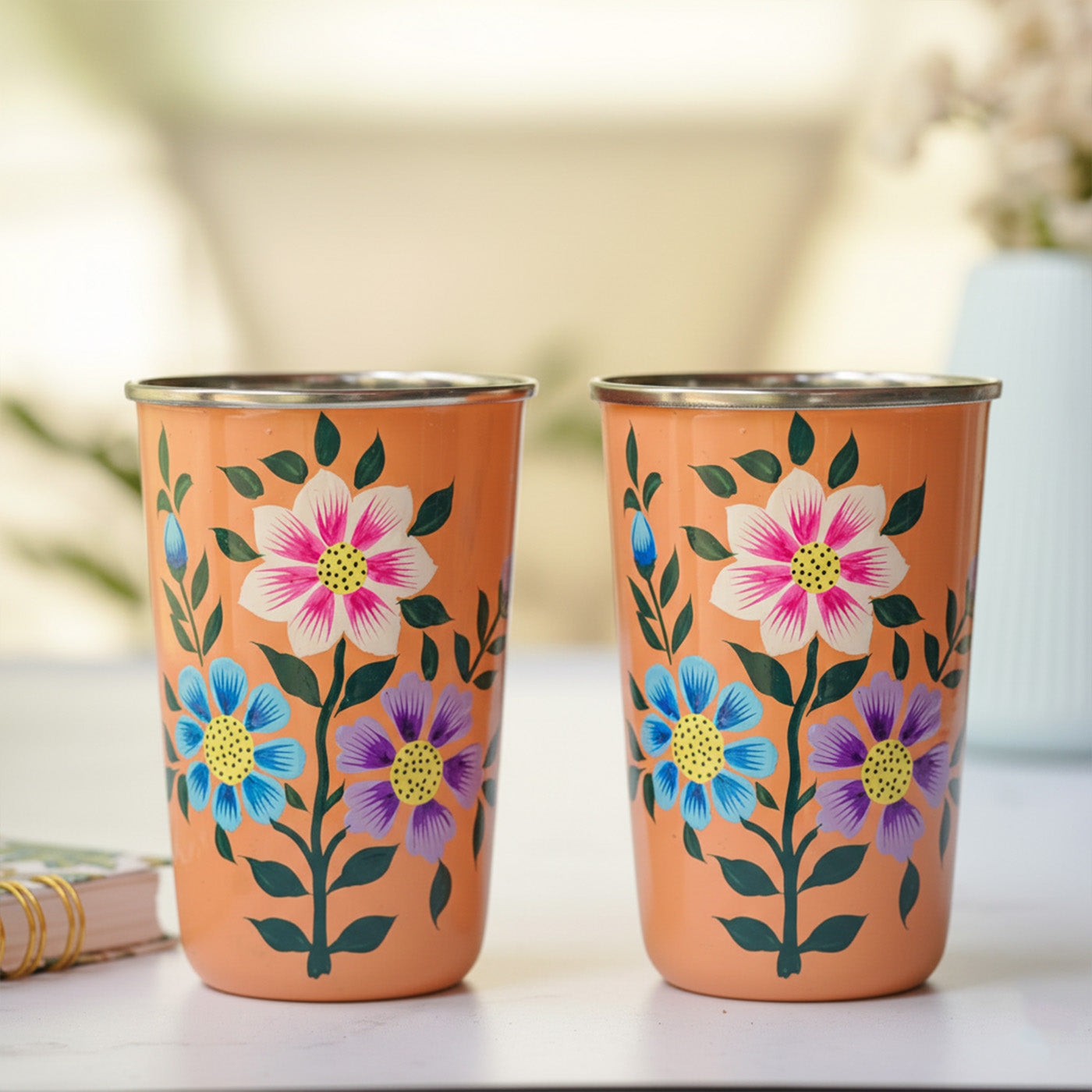 Hand-Painted Kashmiri Art Floral Stainless Steel Glass | Set Of 2