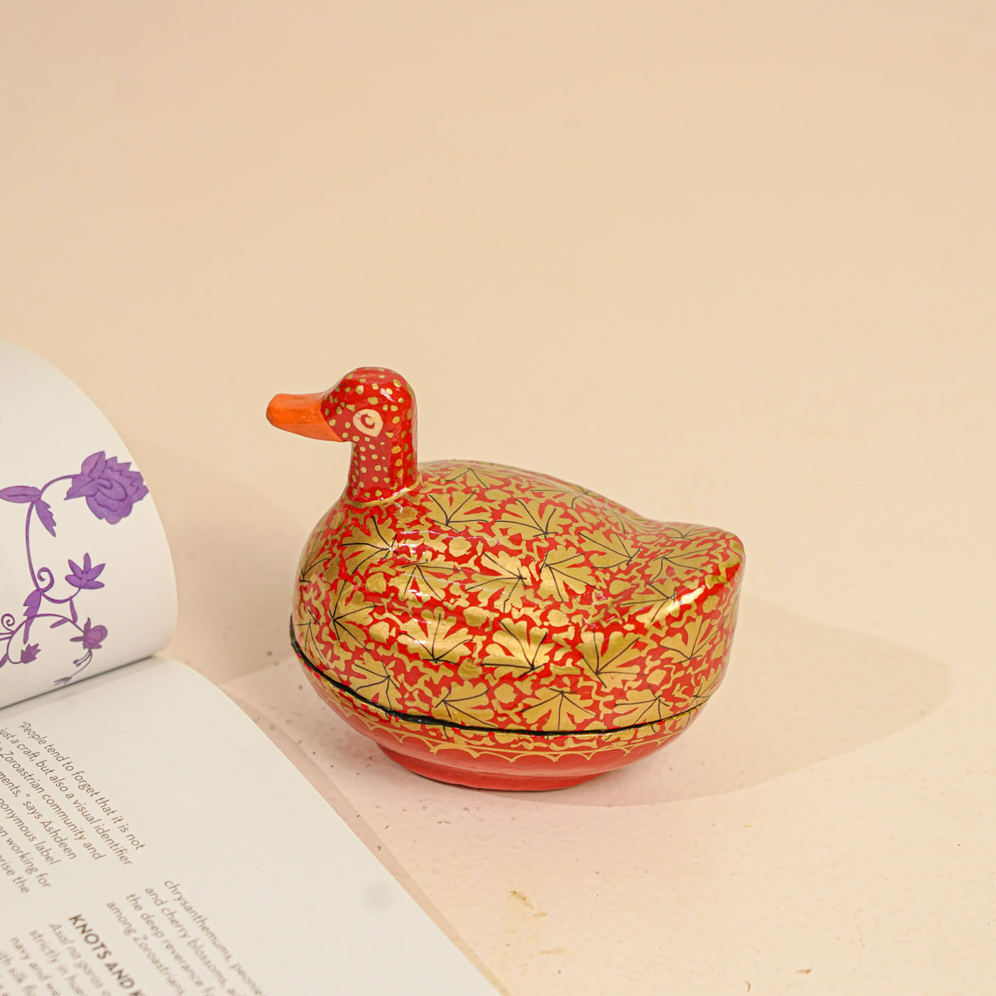 - A beautifully crafted duck-shaped storage box painted in striking red and gold.