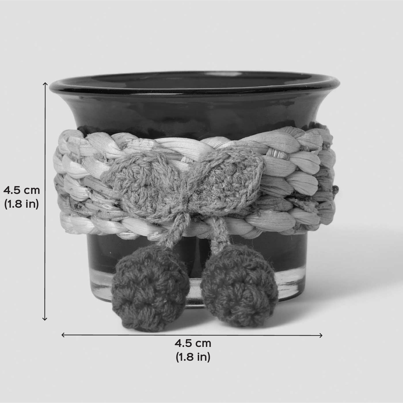 - Each holder features colorful glass bases wrapped in banana bark with crochet cherry accents.