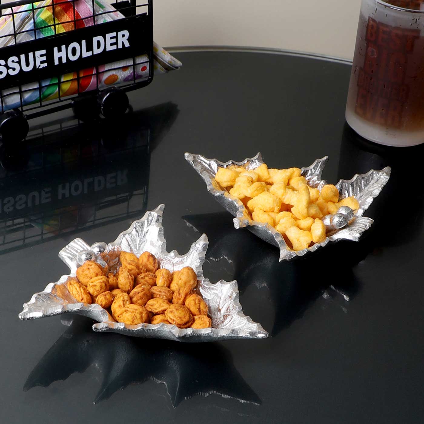 Elevate your dining table decor with this set of 2 handmade aluminum Christmas leaf platters.