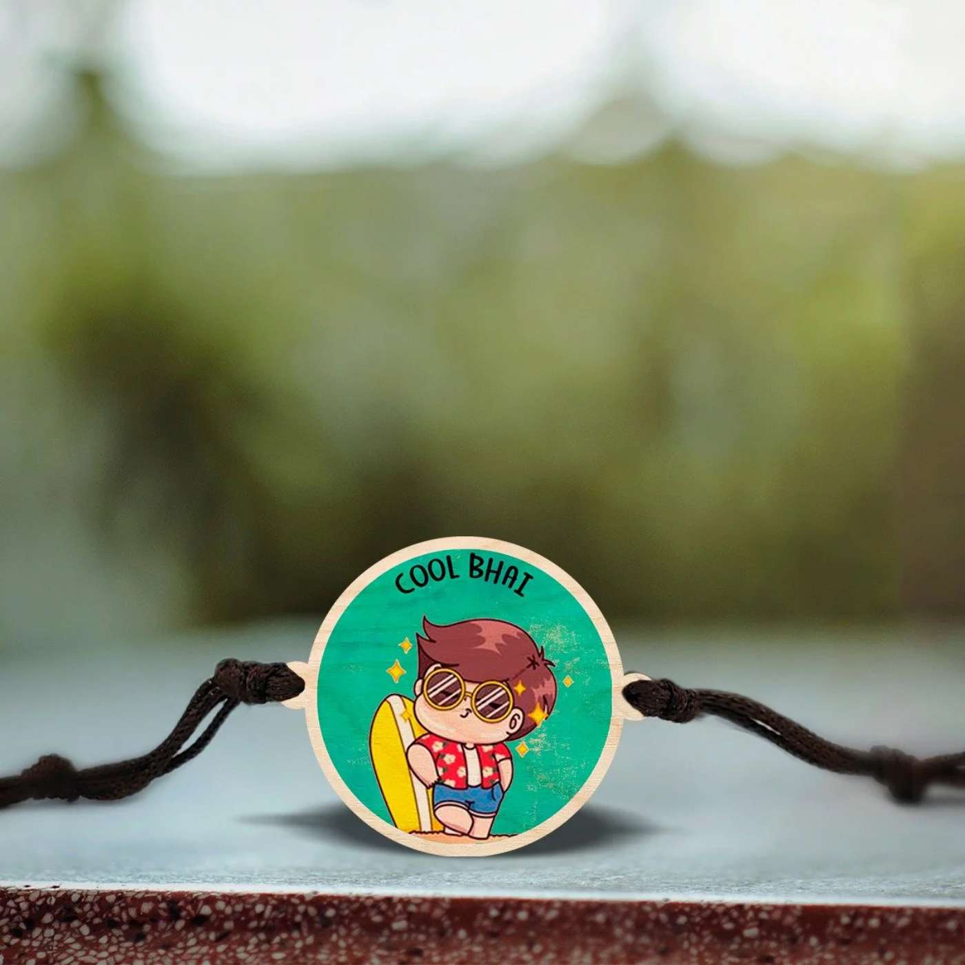 - Express your love with this wooden rakhi saying Cool Bhai!