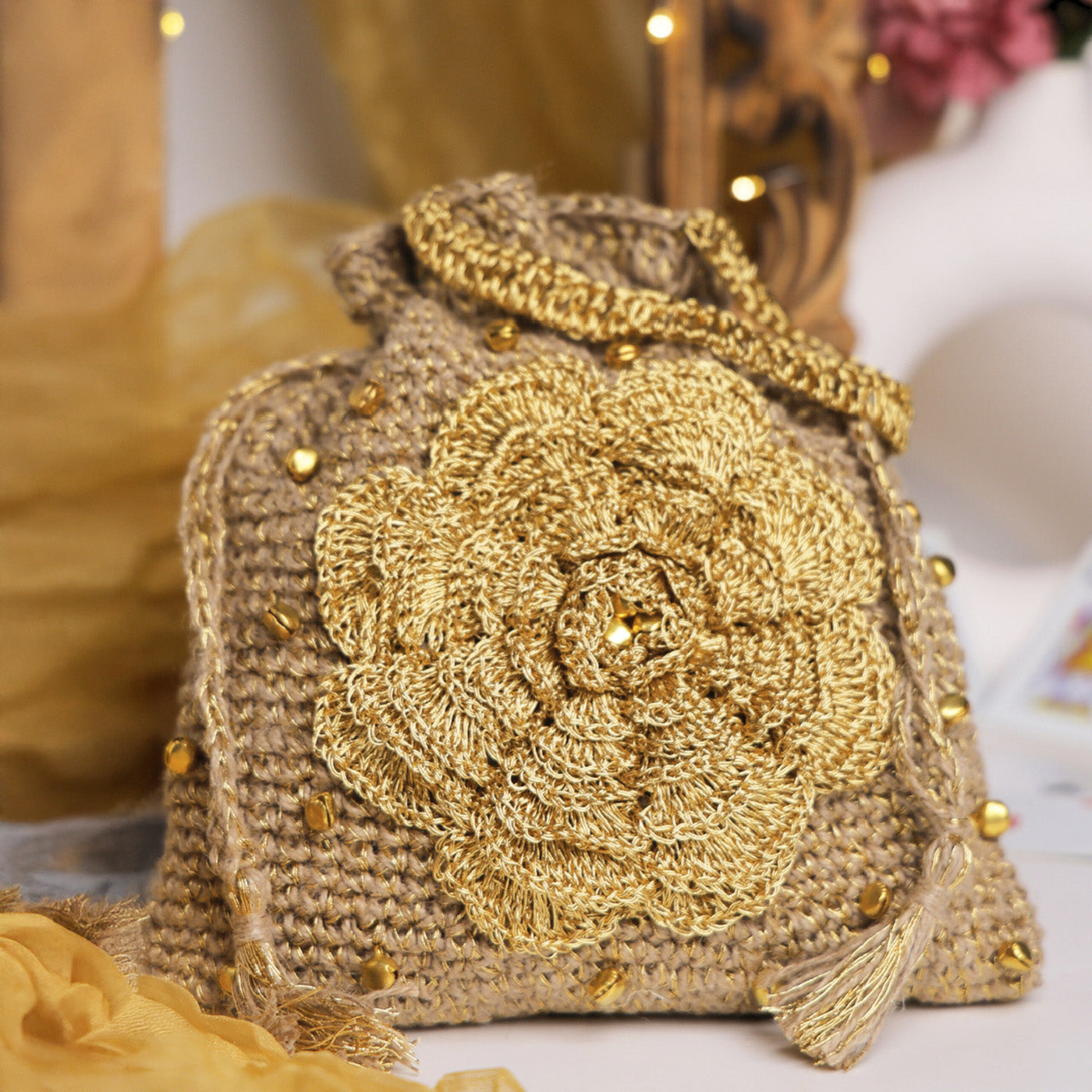 - Crafted in warm golden tones with a textured, handcrafted finish, this crochet potli carries an earthy elegance.