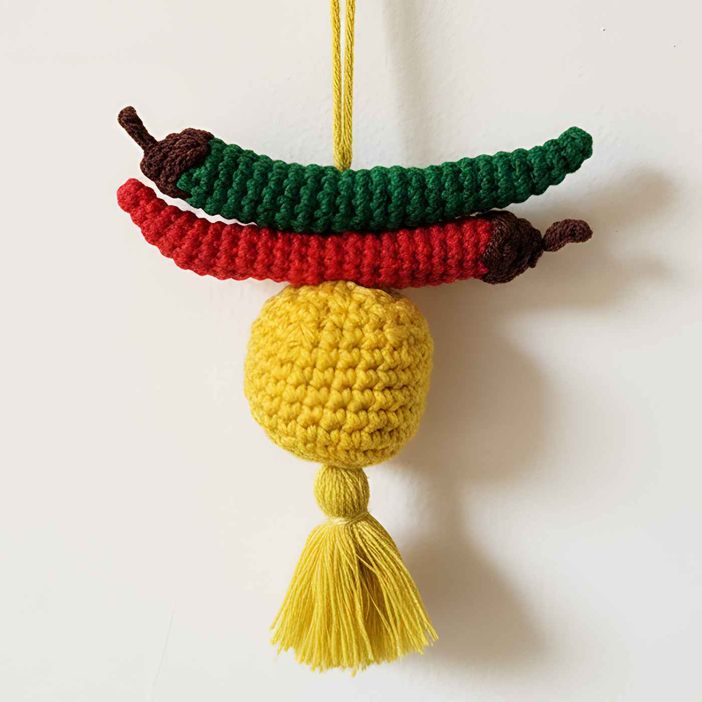 - Featuring crochet lemon and chili motifs, it symbolizes protection and good luck in Indian culture.