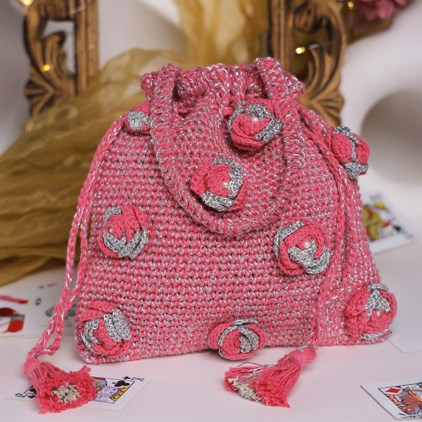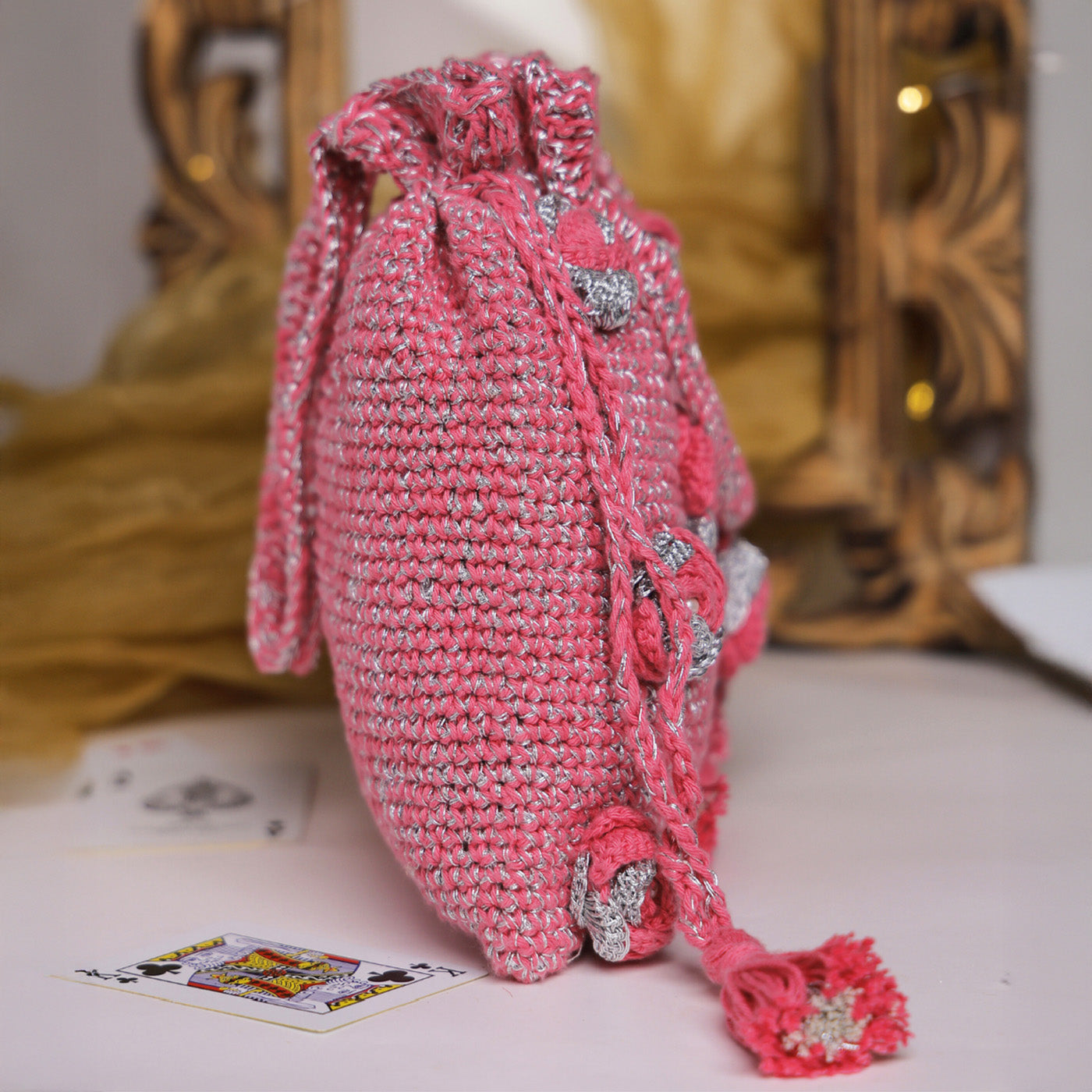 • Crocheted in a soft pink base and delicately interwoven with shimmering silver threads, this potli radiates refined festive elegance.