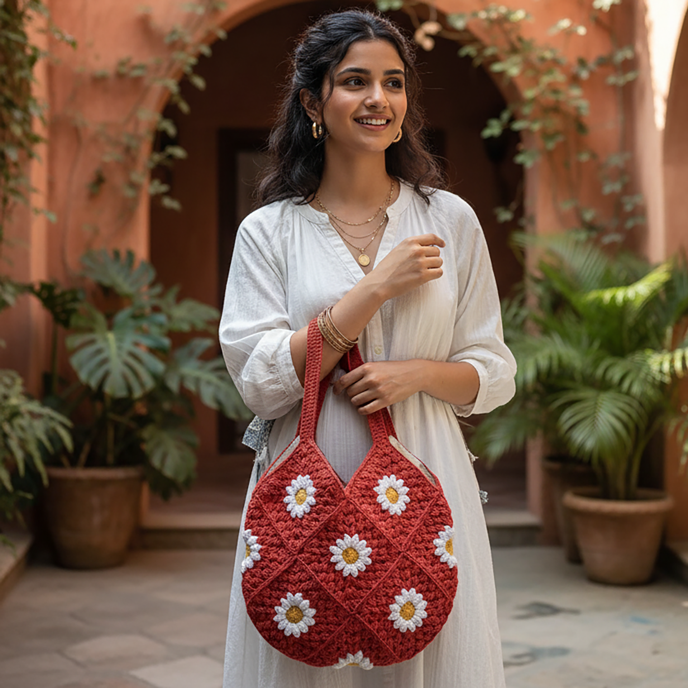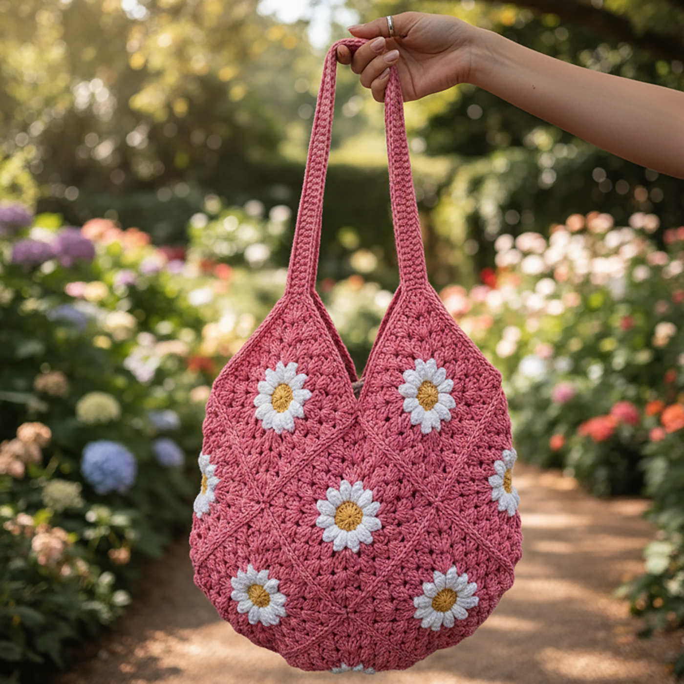 - Crafted from soft cotton yarn, this pink daisy hobo bag is the ideal companion for a beach holiday, casual outings, or grocery runs.