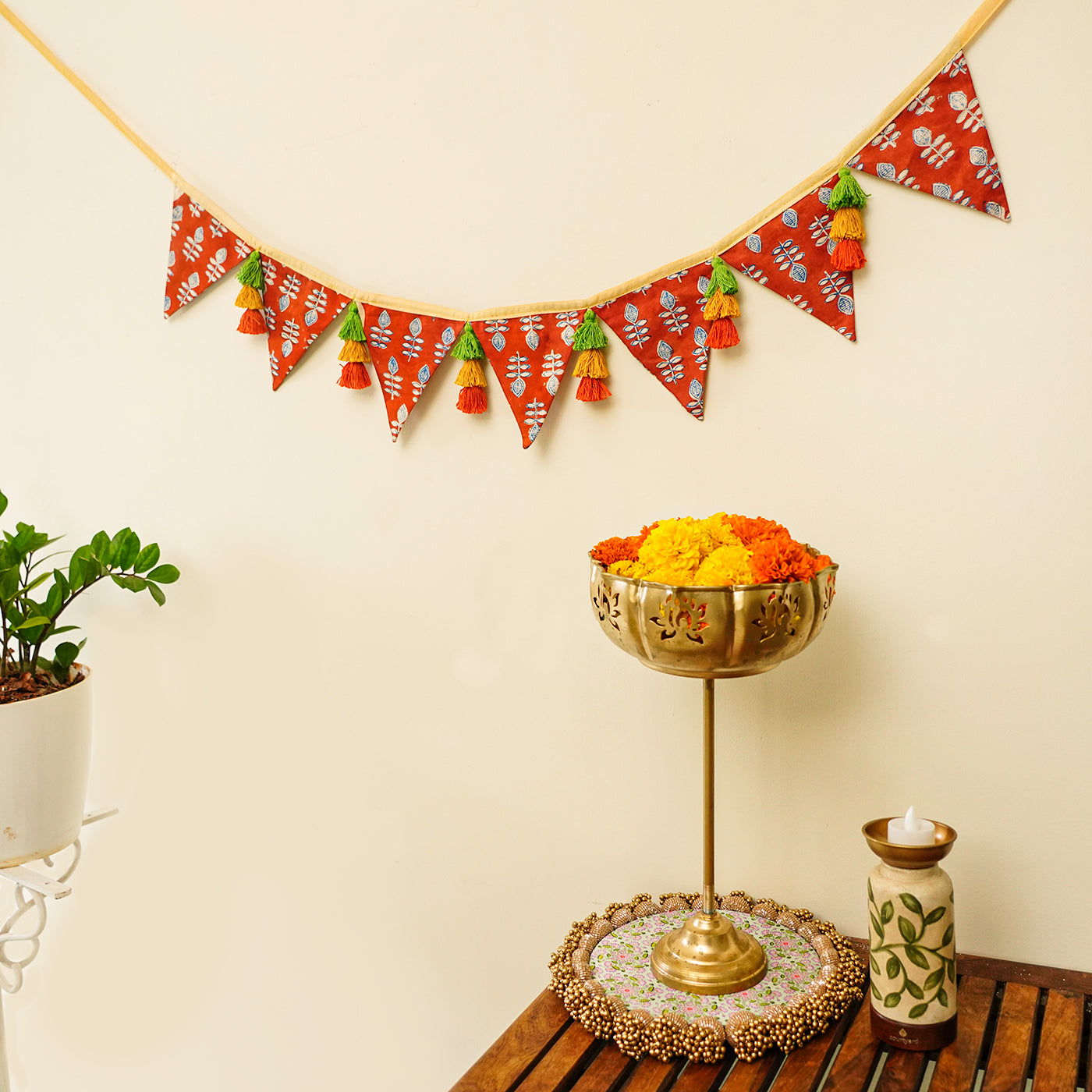 - Crafted from upcycled fabric, wooden beads, and cotton threads, it’s perfect for adorning doors, walls, and temples.