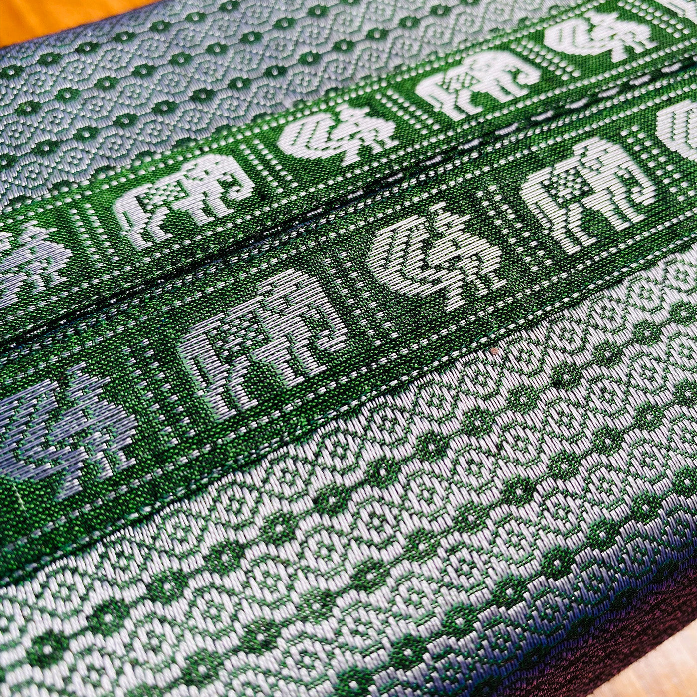 - Intricately woven in Karnataka, it showcases three traditional patterns with an elephant-peacock motif at the top.