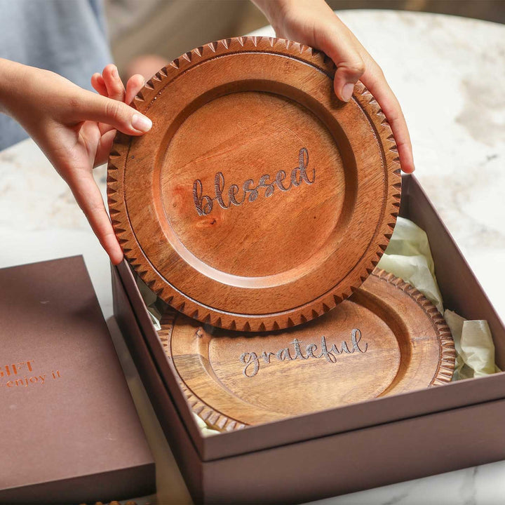 - Each plate carries a meaningful word—Joyful, Grateful, and Blessed—that inspires daily reflection.