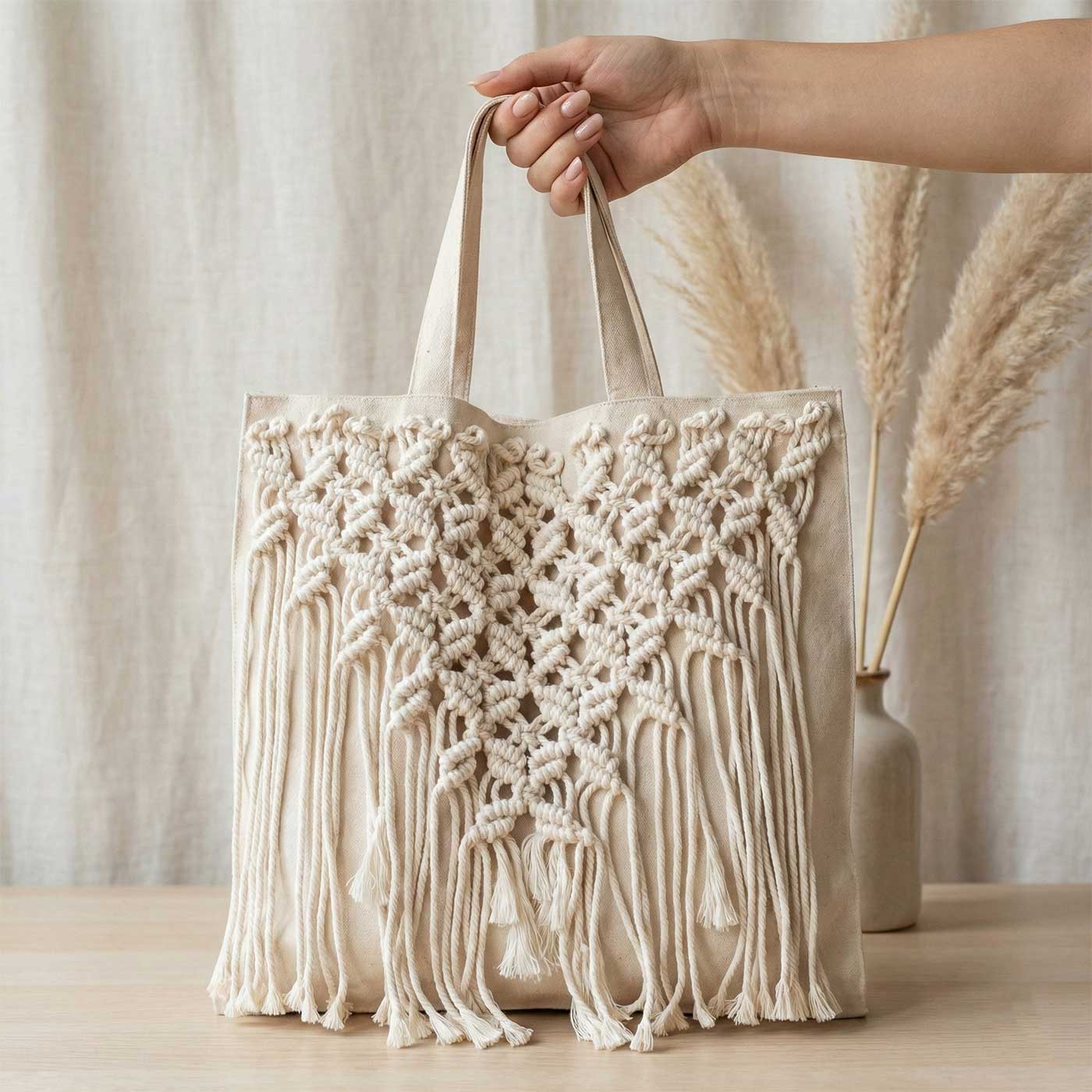 - Sustainably crafted macrame tote designed for everyday versatility and conscious living.