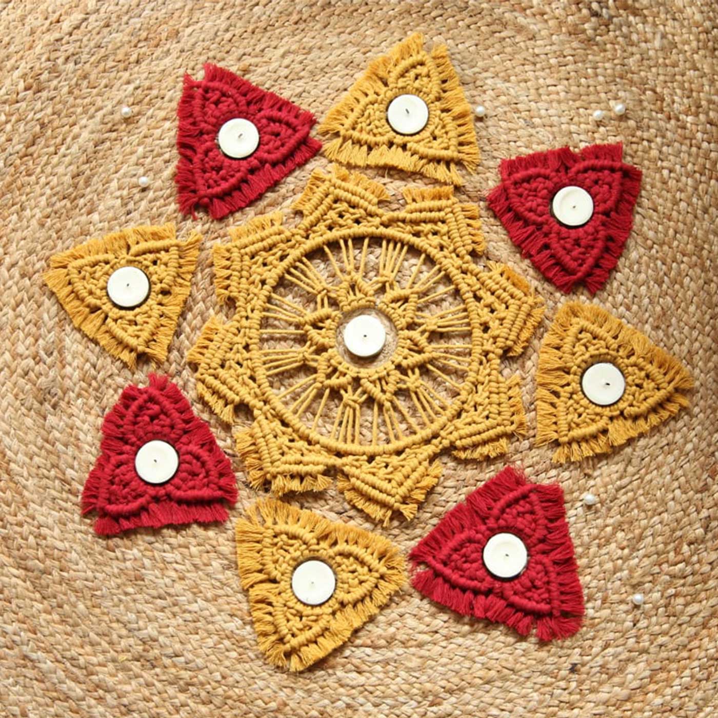 - A beautifully handcrafted macrame rangoli set designed to brighten festive spaces.