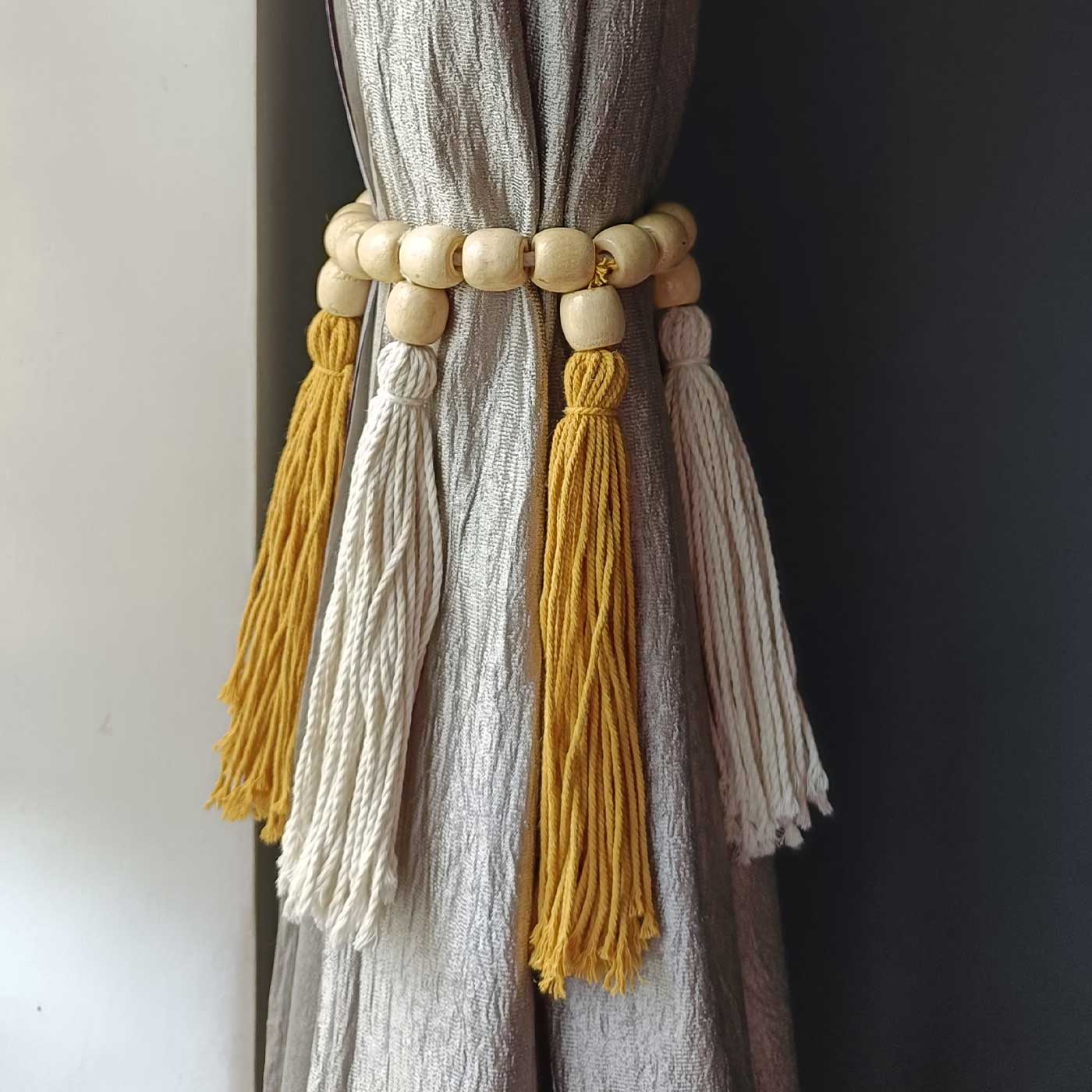 - Handcrafted macrame curtain ties featuring delicate tassels along the length.
