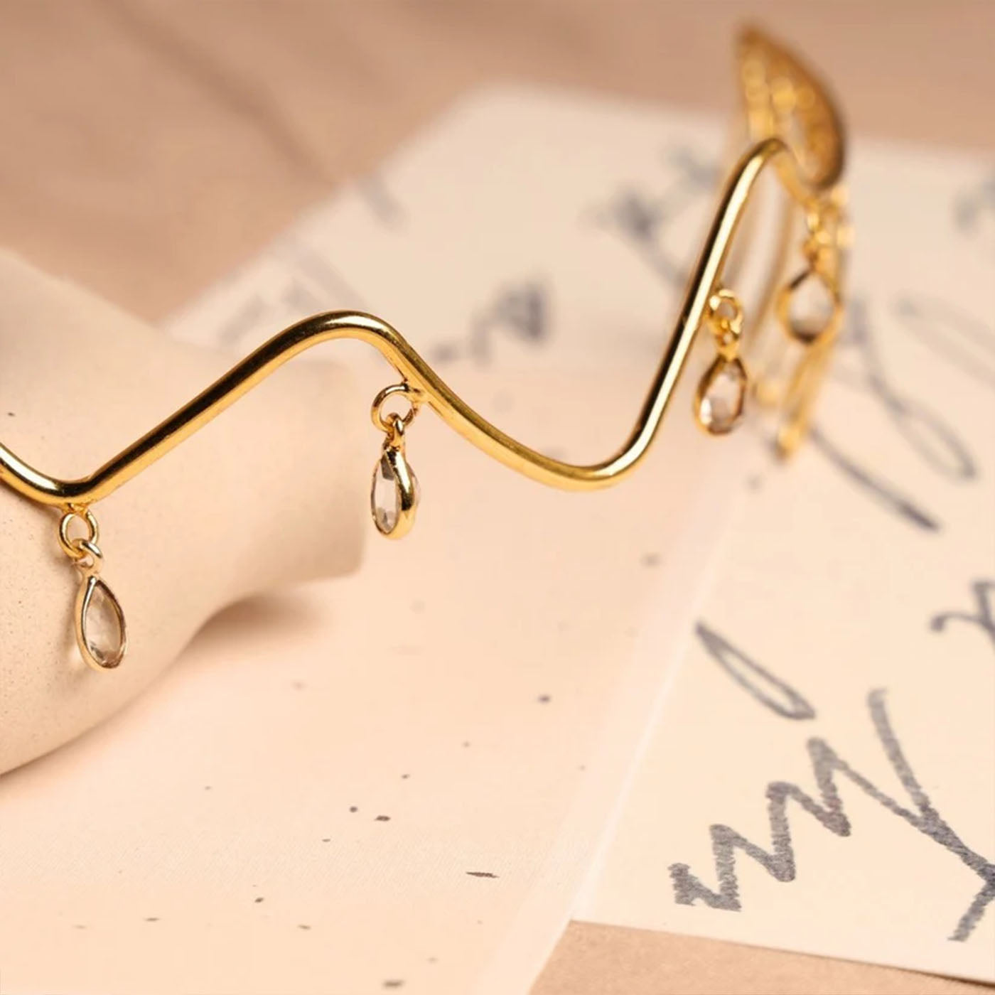 - Inspired by ocean tides, this exquisite headband shimmers with soft accents and wavy contours.