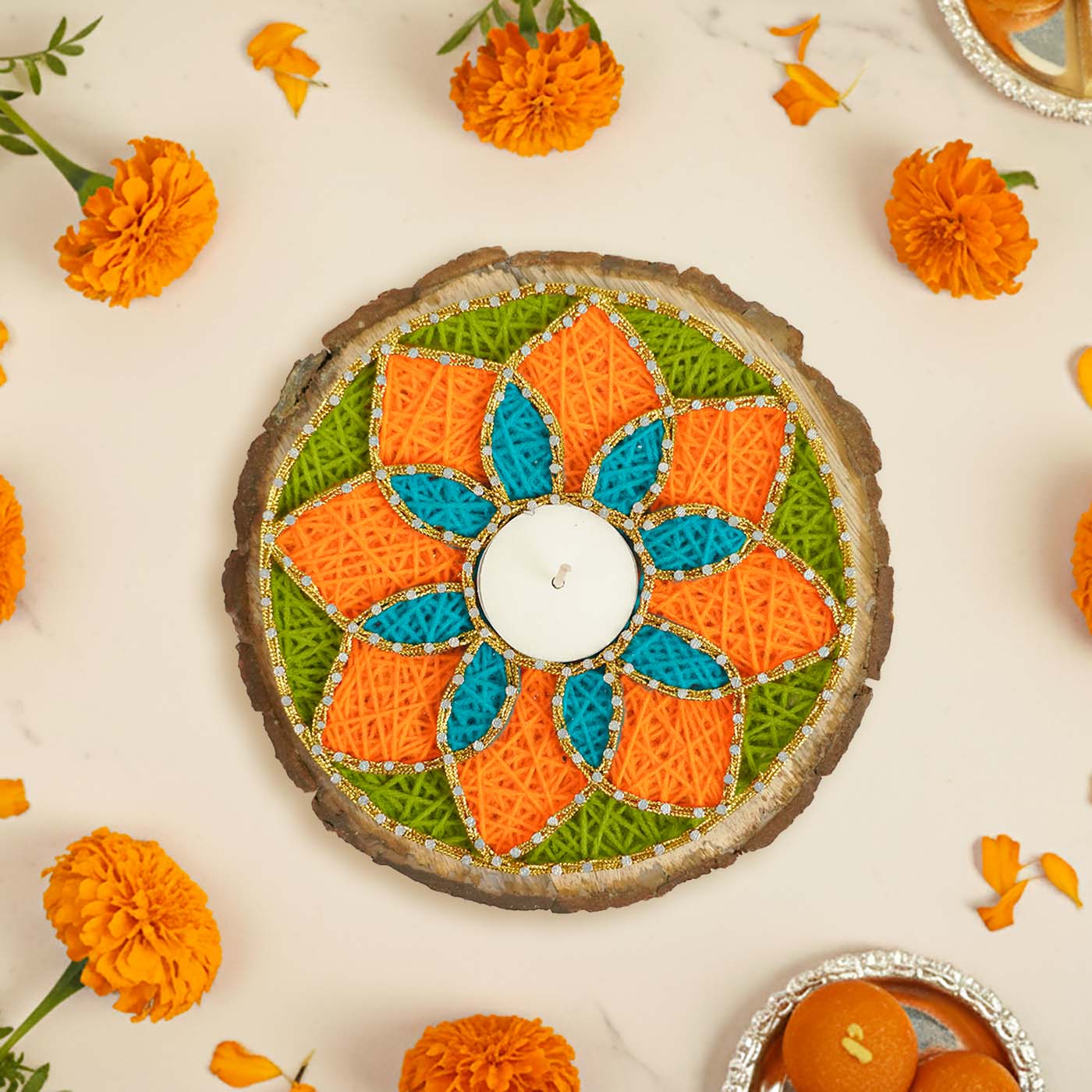 - Its round shape makes it perfect for shelves, tables, or Rangoli corners.