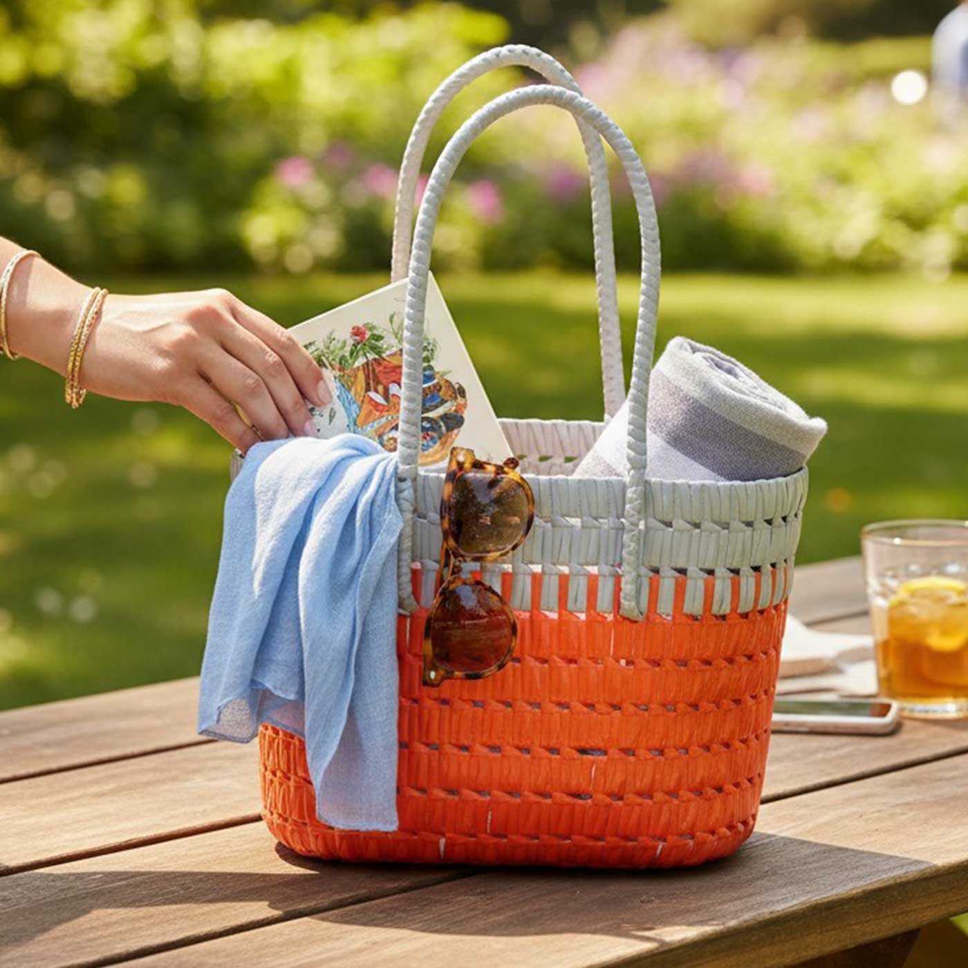 • A beautifully handwoven basket that brings back the charm of 90s-style picnics.