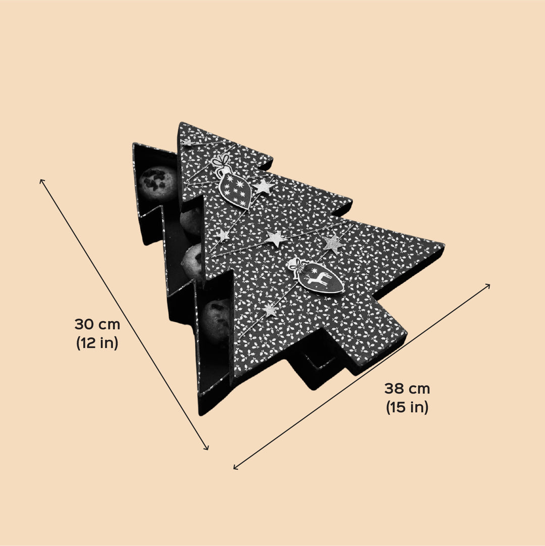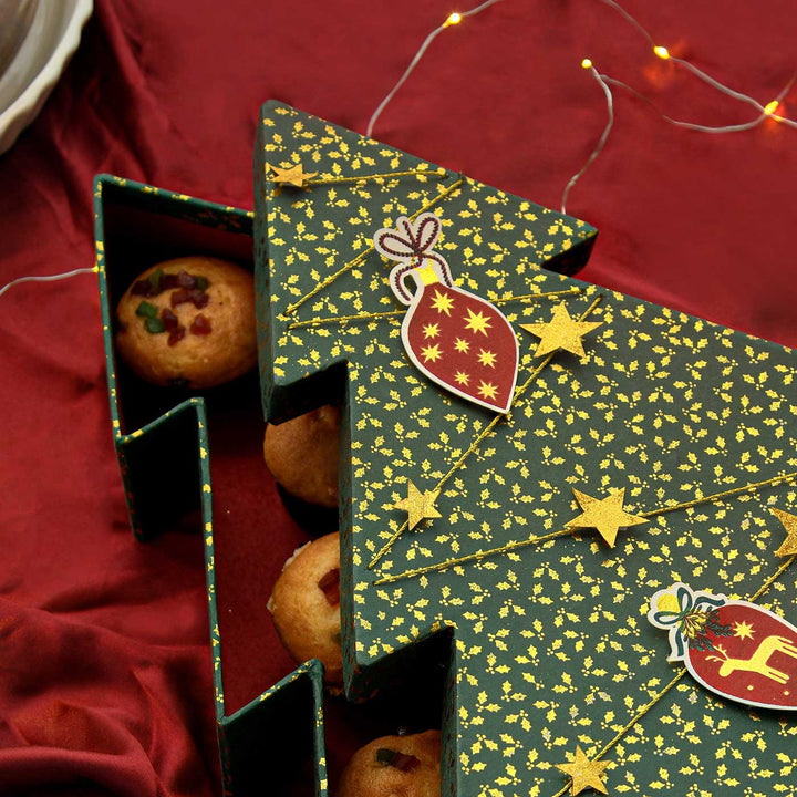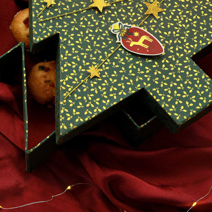 - Bring the magic of Christmas gifting to life with this tree-shaped box, crafted in a festive palette of green, gold, and red.