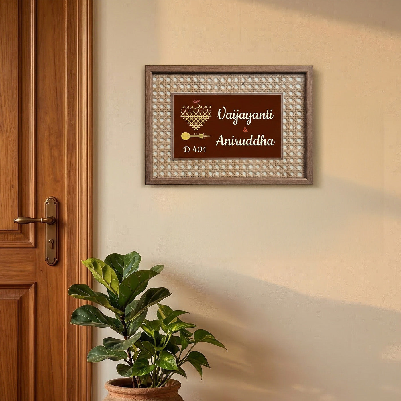 Handmade Veena & Kolam Motif Rattan Name Plate With Wooden Frame