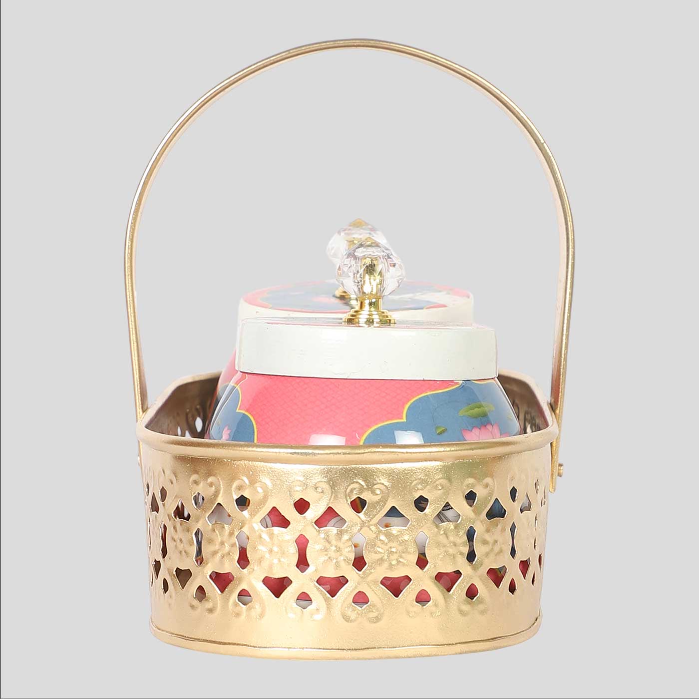 - Add a functional and stylish storage solution to your home with this handmade metal basket with 2 jars.