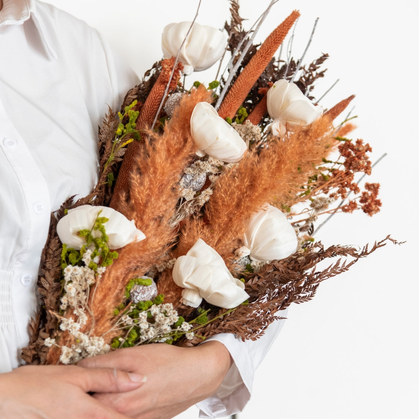 - Elevate your space with the Handmade White Wildwood Dried Flower Bunch, featuring rustic tones, soft green fillers, and handcrafted white sola wood flowers.
