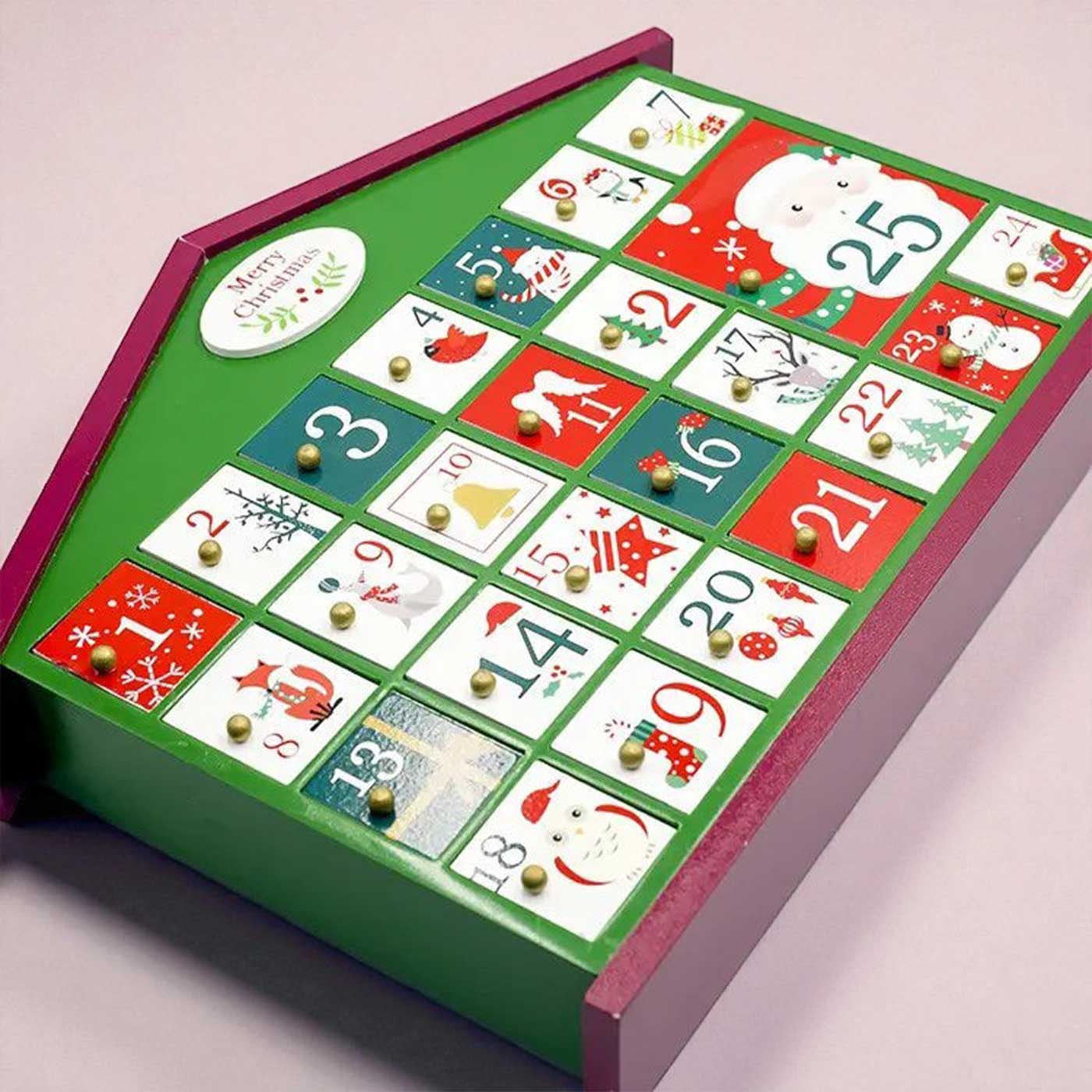 - Step into the magic of Christmas with this exquisite wooden advent calendar shaped like a festive townhouse.