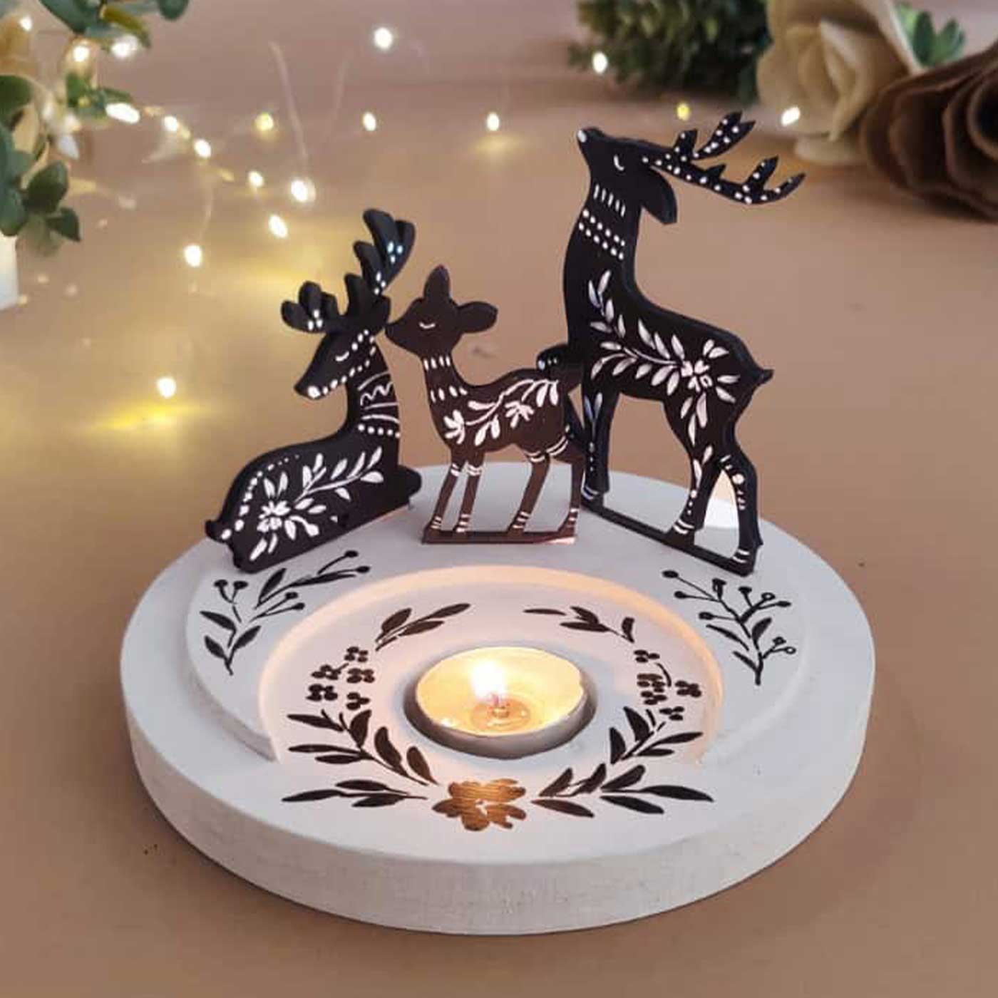 • The warm candlelight filters through the artwork, creating a magical winter-forest glow.