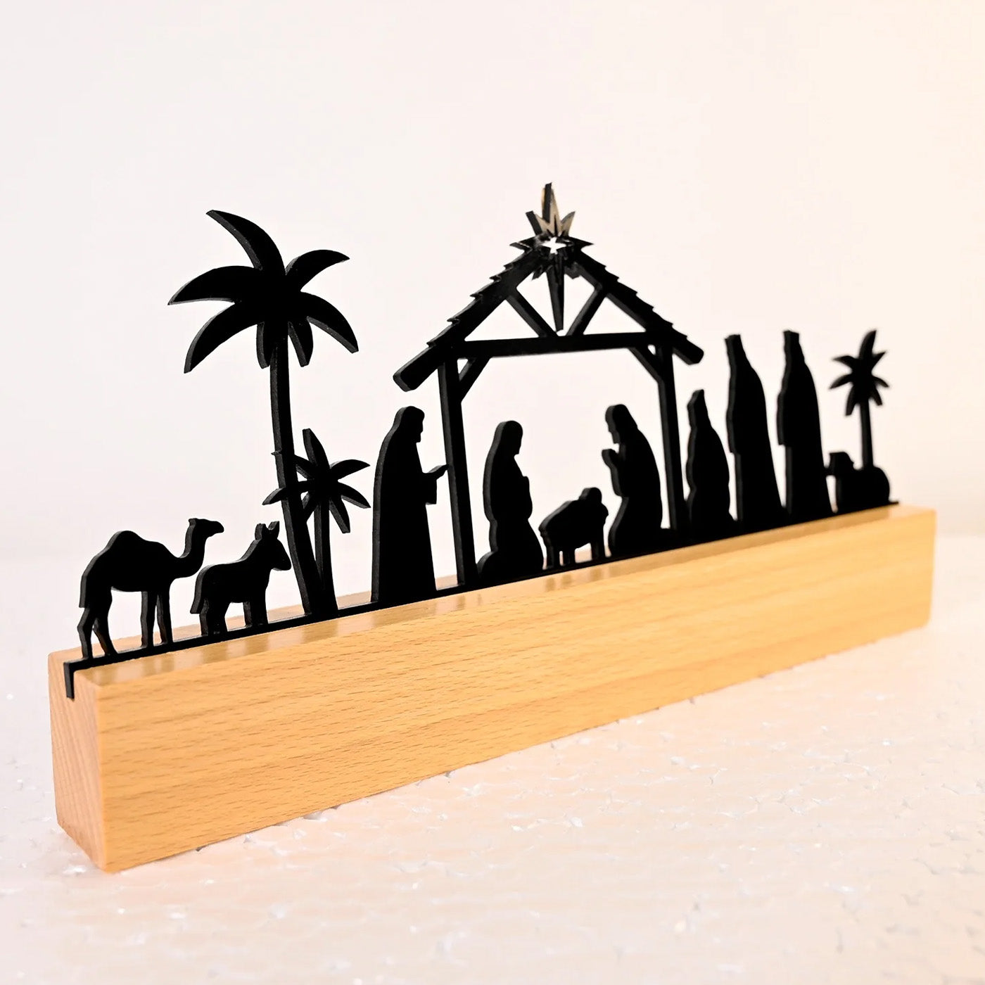 - The striking black acrylic cutout depicts the holy scene of Jesus’ birth with timeless simplicity.