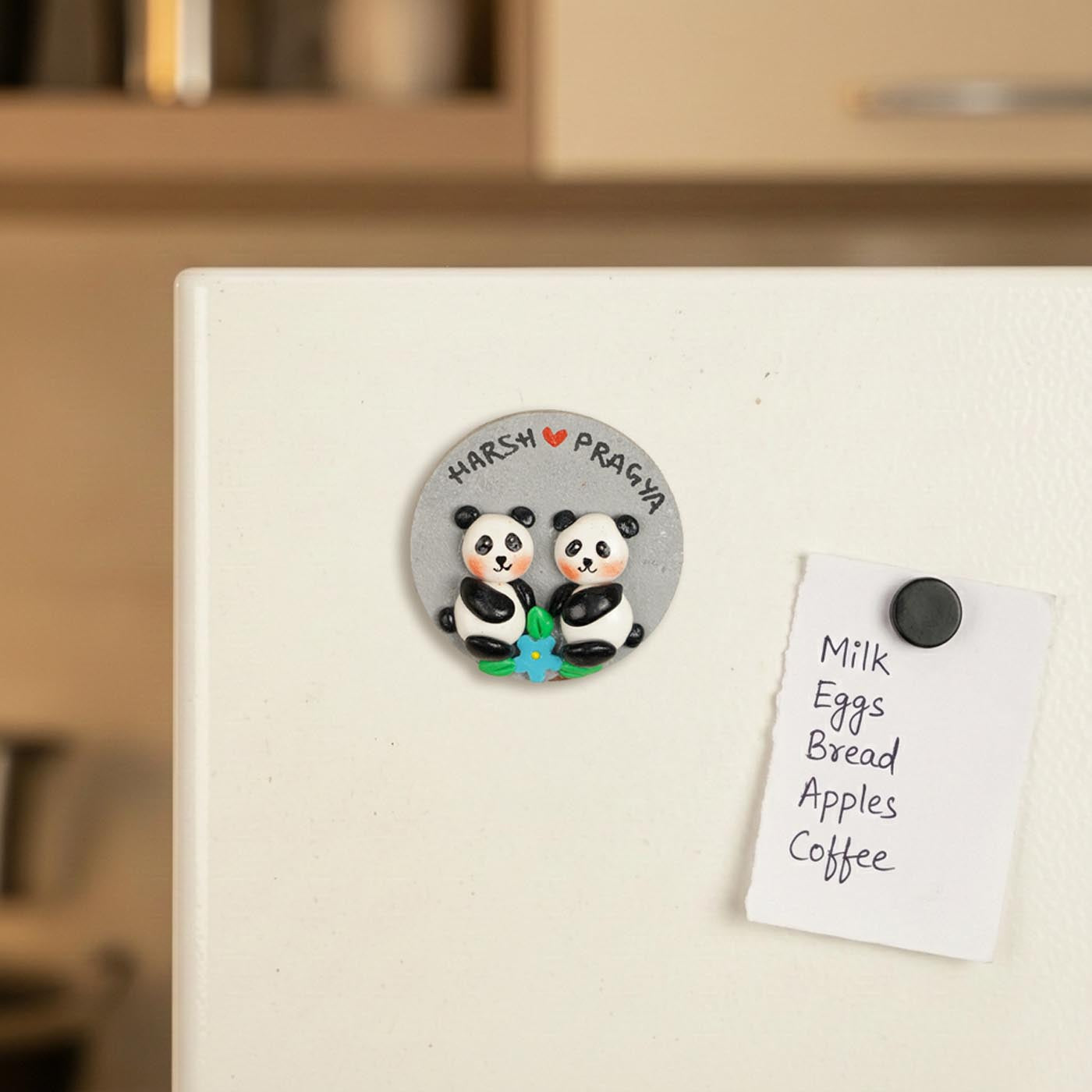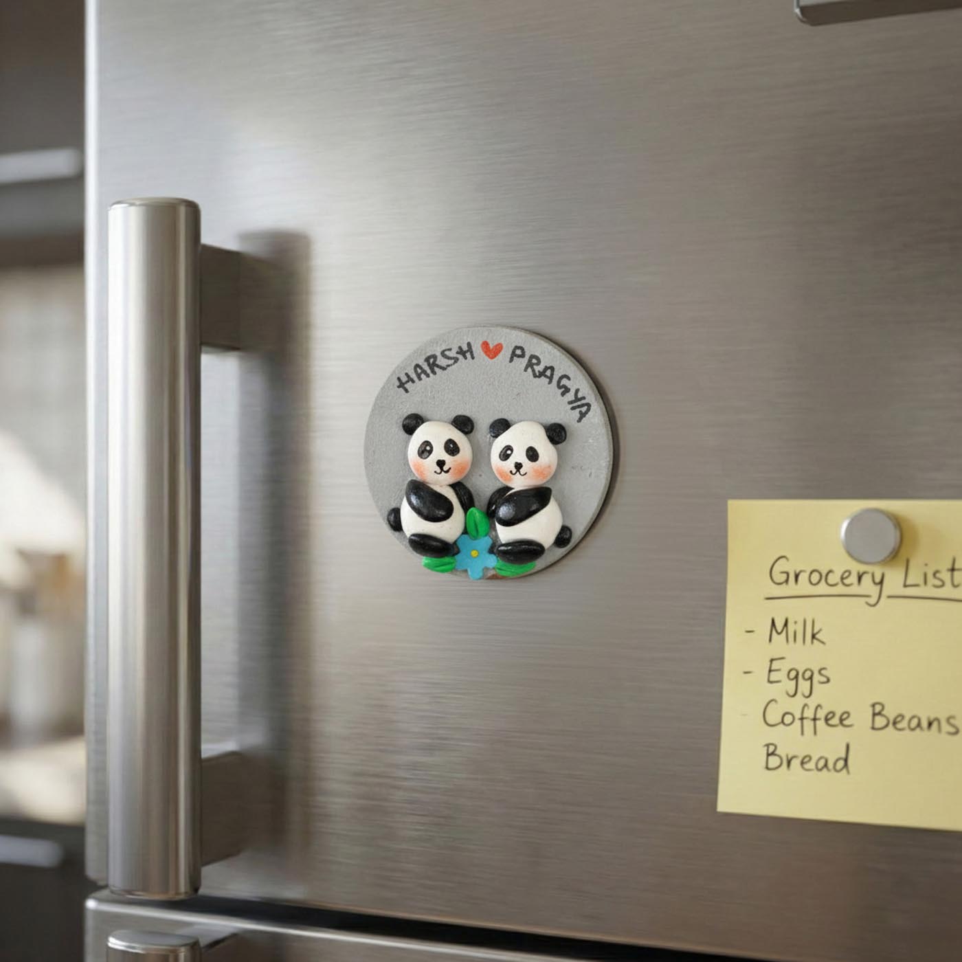 Handcrafted panda fridge magnets inspired by soft, joyful togetherness.
